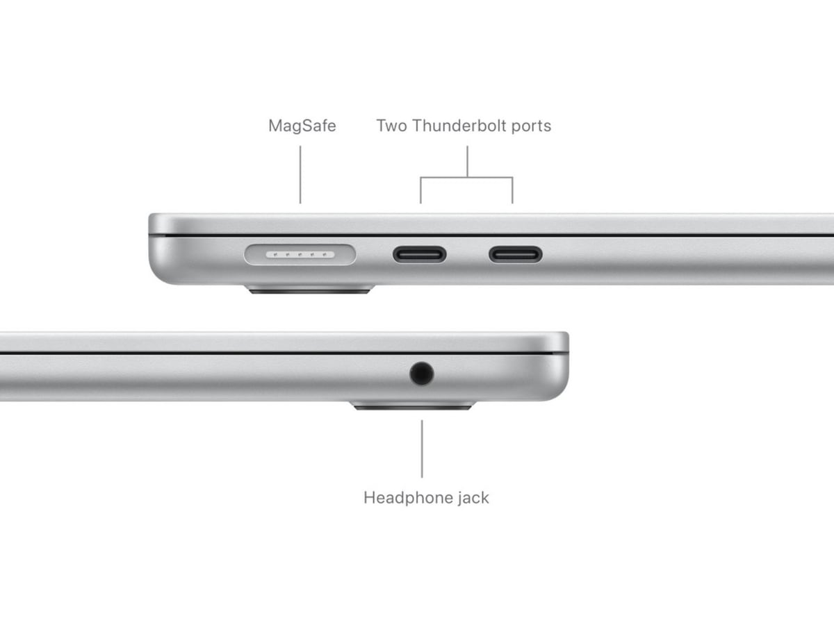 - HELT ANSLUTEN – MacBook Air har två Thunderbolt-portar, ett hörlursuttag, wifi 6E,(4) Bluetooth 5.3 och en MagSafe-laddningsport. Anslut upp till två externa bildskärmar med maskinen stängd.