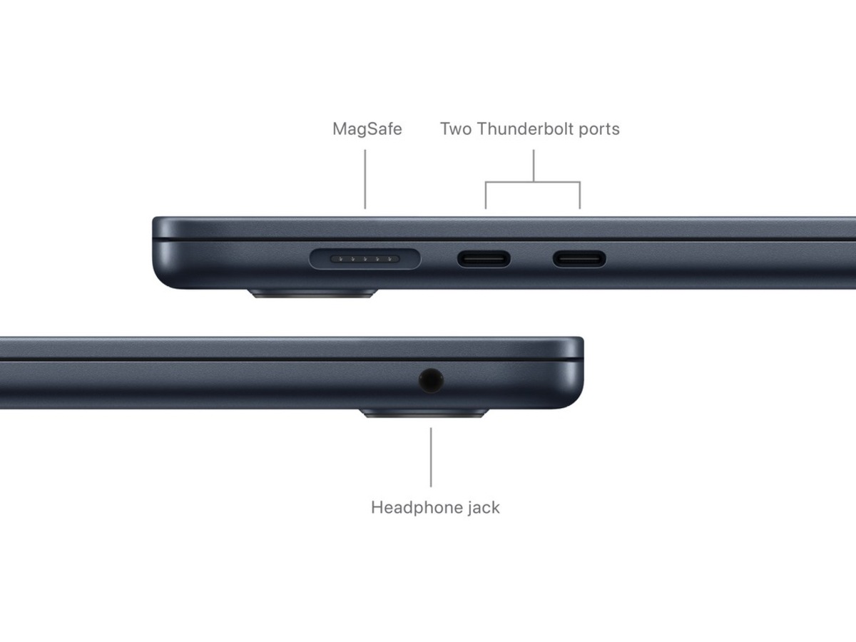 - HELT ANSLUTEN – MacBook Air har två Thunderbolt-portar, ett hörlursuttag, wifi 6E,(4) Bluetooth 5.3 och en MagSafe-laddningsport. Anslut upp till två externa bildskärmar med maskinen stängd.