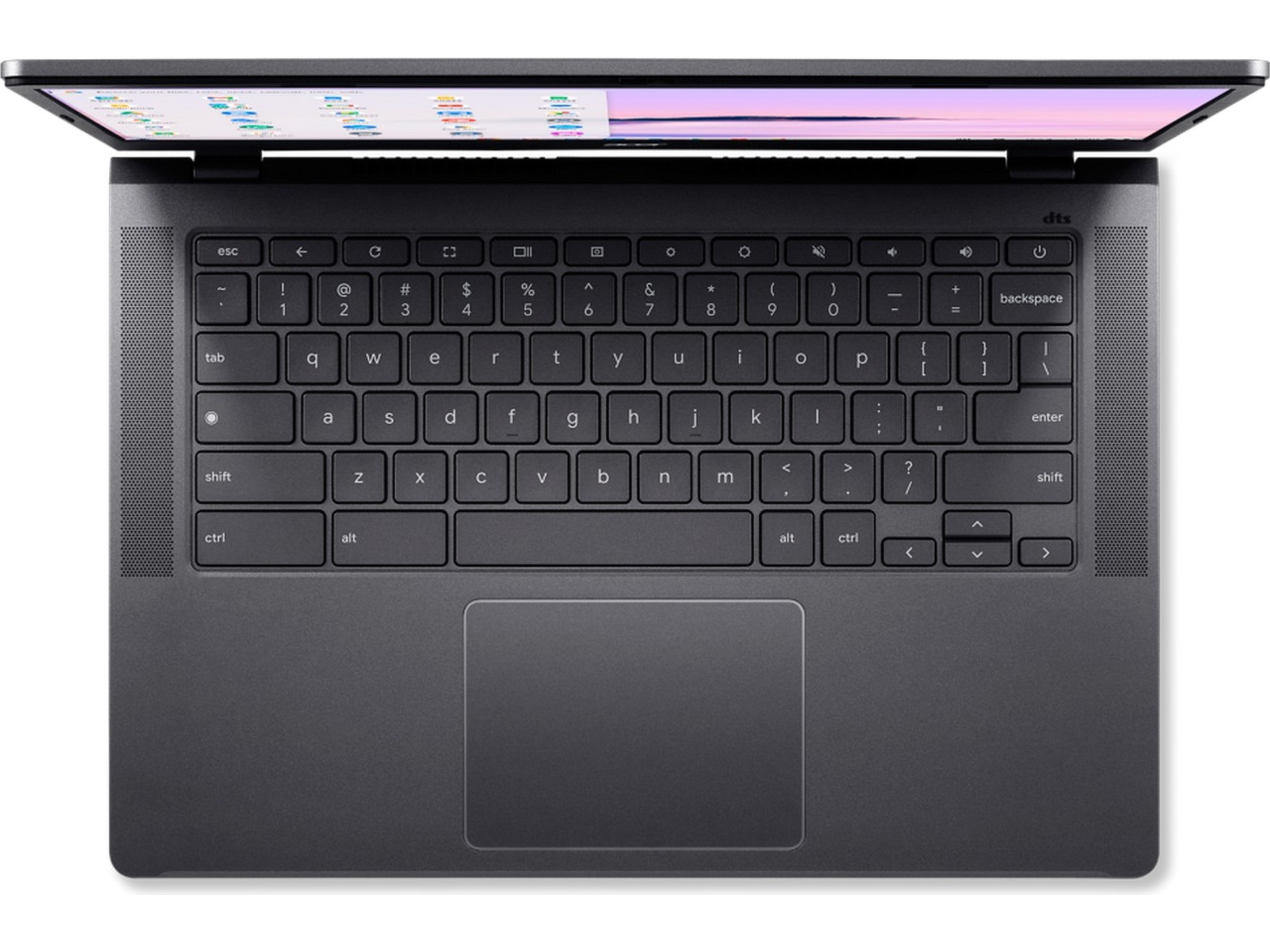 DTS® Audio och ett snabbladdande batteri med 9,5 timmars batteritid gör denna Chromebook Plus perfekt för underhållning när du är på språng. Ta med den nästan var som helst utan att behöva använda laddare samtidigt som du njuter av högkvalitativt ljud från de två uppåtriktade högtalarna.