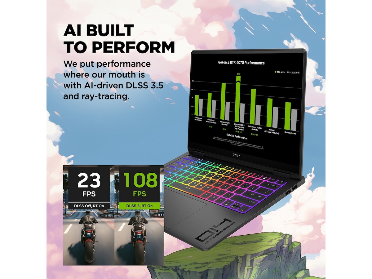 Intel® Core™ Ultra-processor och grafikprocessorer i NVIDIA® GeForce RTX™ 40- serien med AI DLSS 3.5 och strålspårning – inga vaga löften, maximal prestanda.