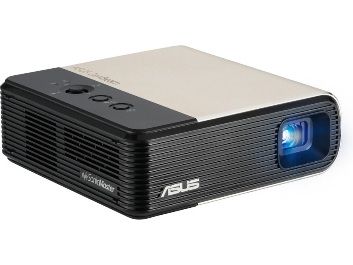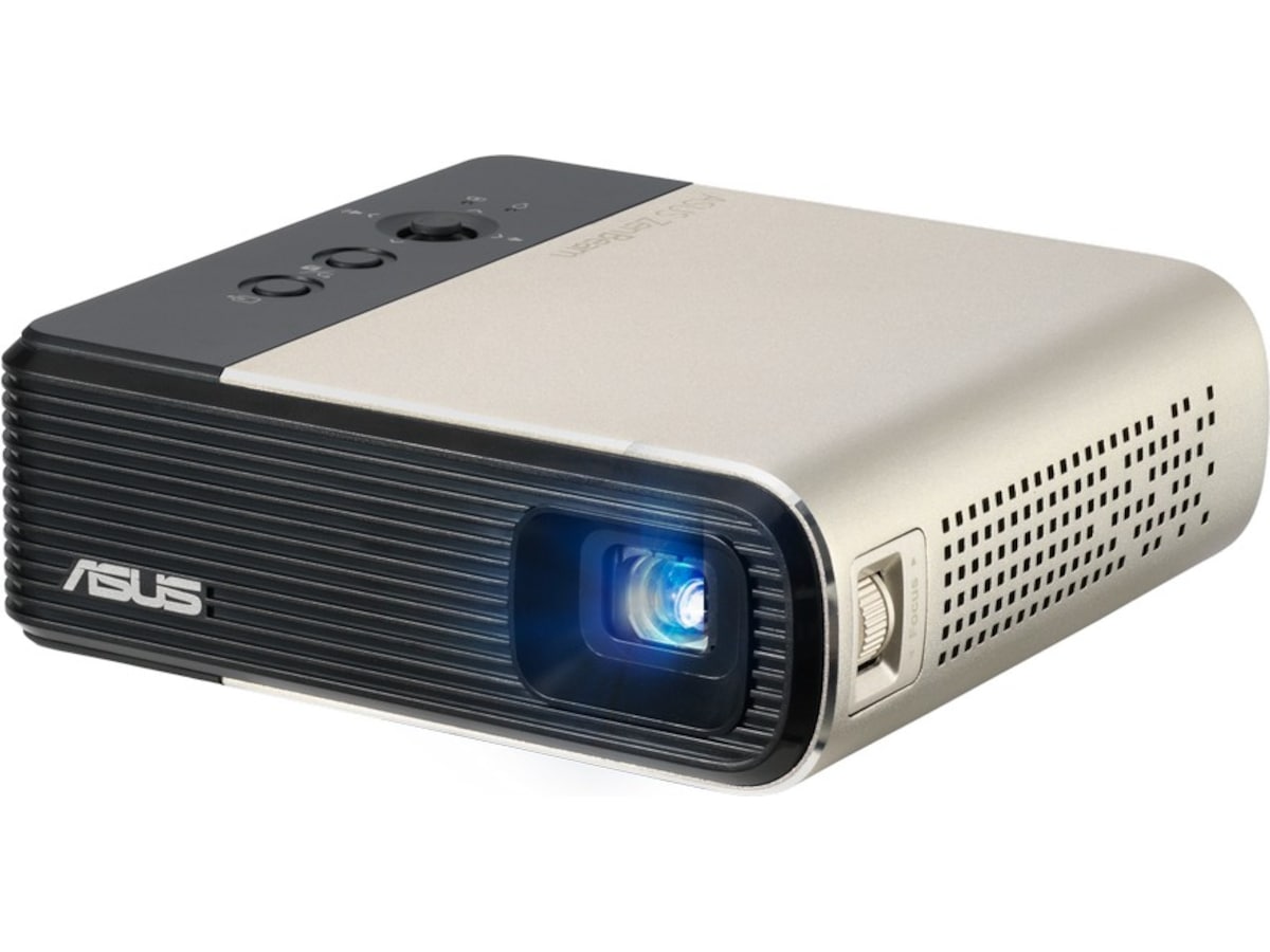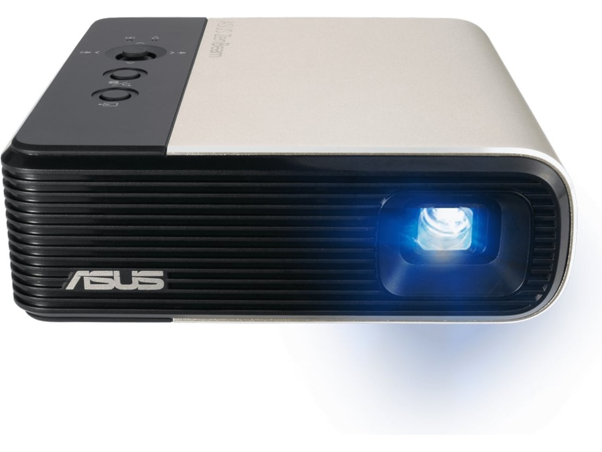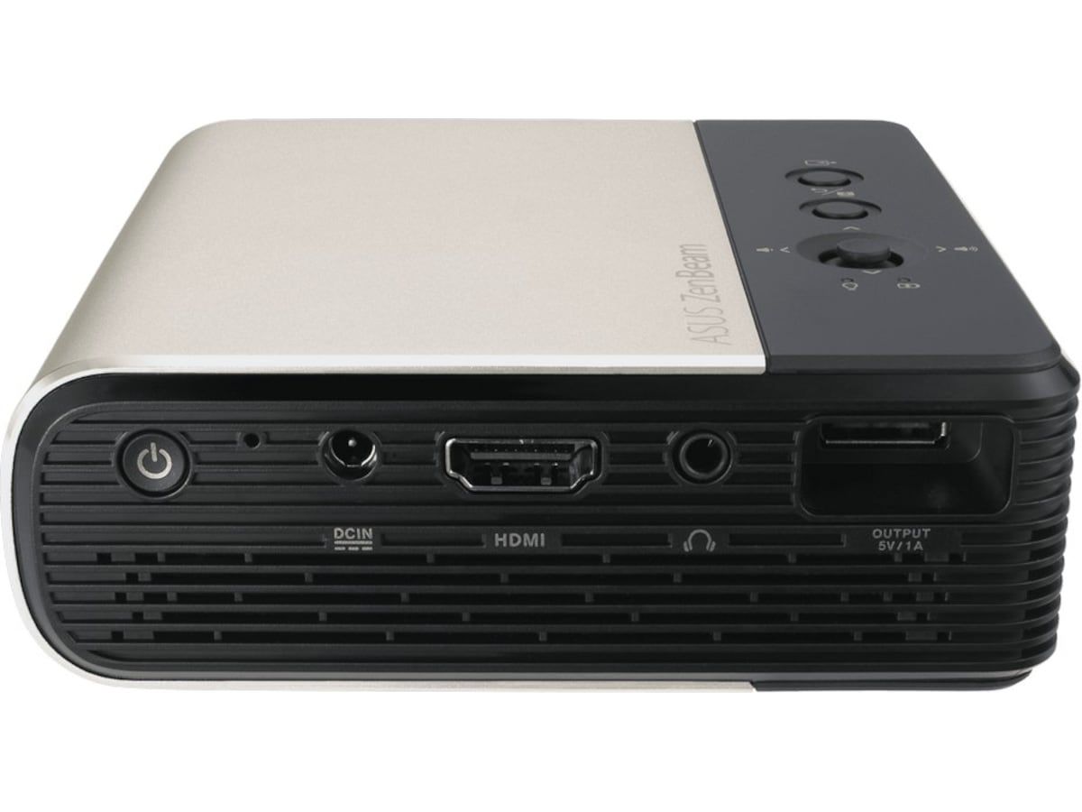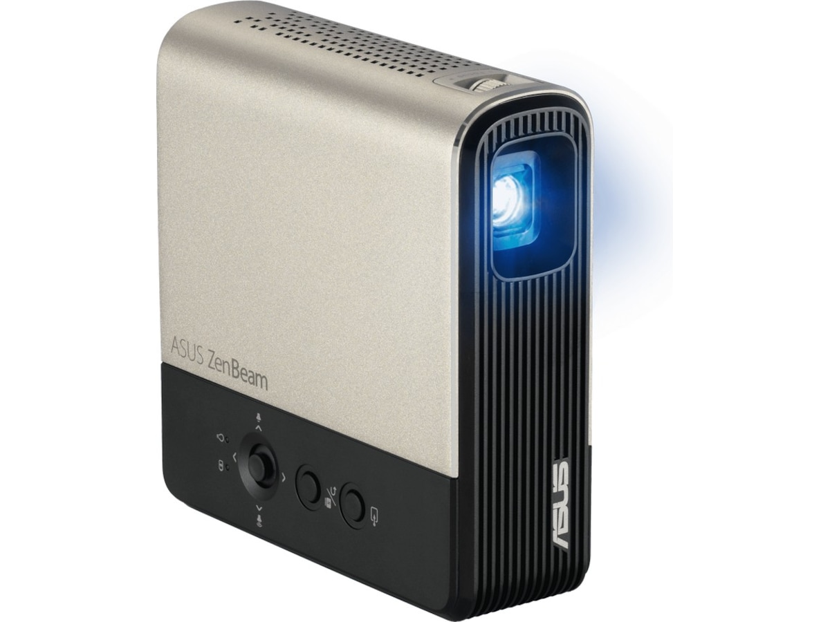 ASUS ZenBeam E2 mini LED projector, automatic portrait projection mode, 300 LED lumens, WVGA (854 x 480), wireless mirroring, built-in battery for up to 4-hour portable video playback, power bank, USB Type-A, HDMI, 5-watt speaker