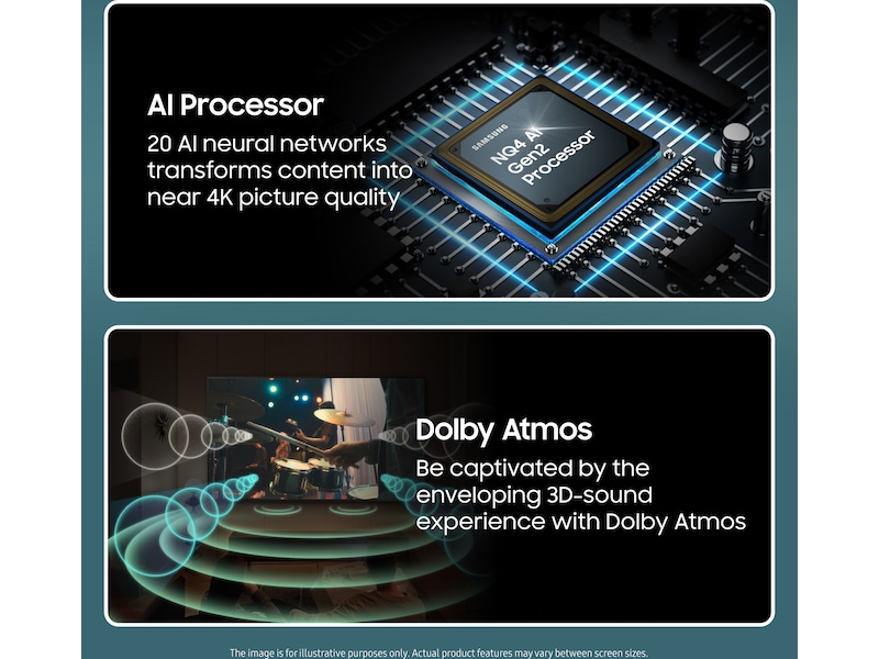 Njut av skärmens underbara dynamik med den AI-drivna processorn. Dolby Atmos™ levererar ett fylligt 3D-ljud, speciellt om det kombineras med en Q-Symphony-aktiverad soundbar.