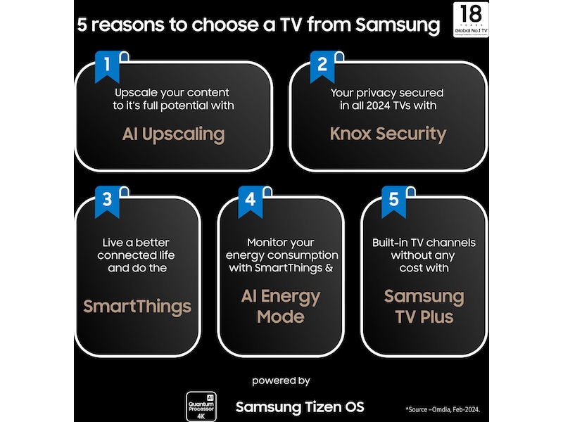 *Gäller vid köp av utvalda 2024 Samsung TV hos utvalda återförsäljare. Garantin är giltig i 10 år från köpdatum. Kräver en kopia på inköpskvitto samt registrering på Samsungs hemsida inom 90 dagar efter köp. Gäller köp av utvalda 2024 års TV-modeller till och med 31 Mars 2025. www.samsung.com/se/offer/offline/screen-burn-warranty/