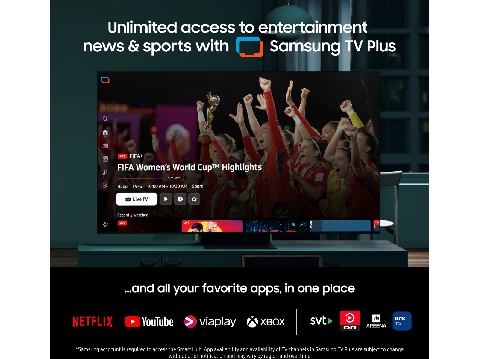 *Utbudet av appar och tjänster varierar över tid, då gamla kan upphöra och nya tillkomma. Vissa appar och tjänster kräver abonnemang eller engångsköp för att kunna användas. Samsung kan visa reklam och kampanjer på Smart TV-gränssnittet och applikationer. Skärmspegling fungerar endast när TV och mobil är påslagna och anslutna till samma WiFi-nätverk. Apple och AirPlay är varumärken som tillhör Apple Inc., registrerade i USA och andra länder/regioner. AirPlay kräver iOS 12.3 eller senare eller macOS 10.14.5 eller senare.