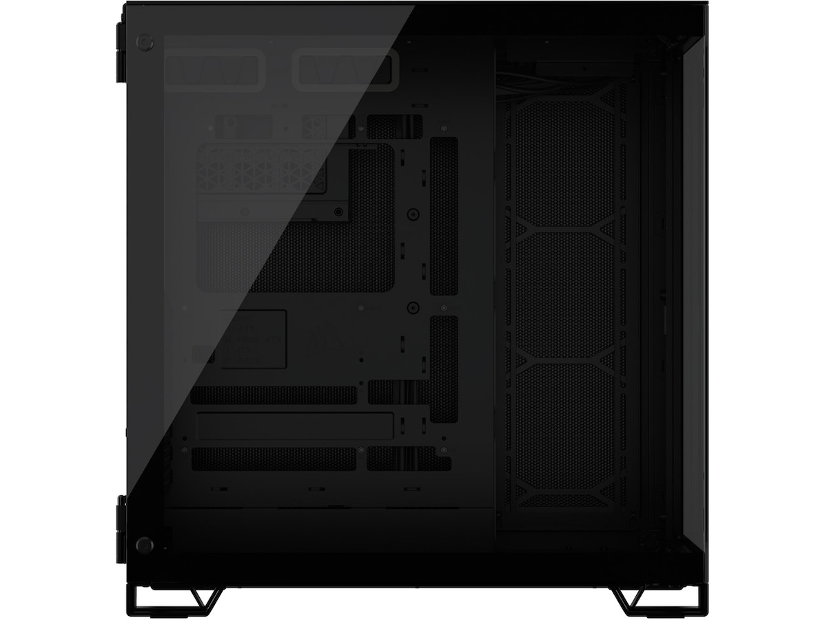 Egenskaper hos systemkabinett Dubbelkammarlayout, Sidopanel i tempererat glas, Frontpanel av glas, Nedre dammfilter, Nätöverdel