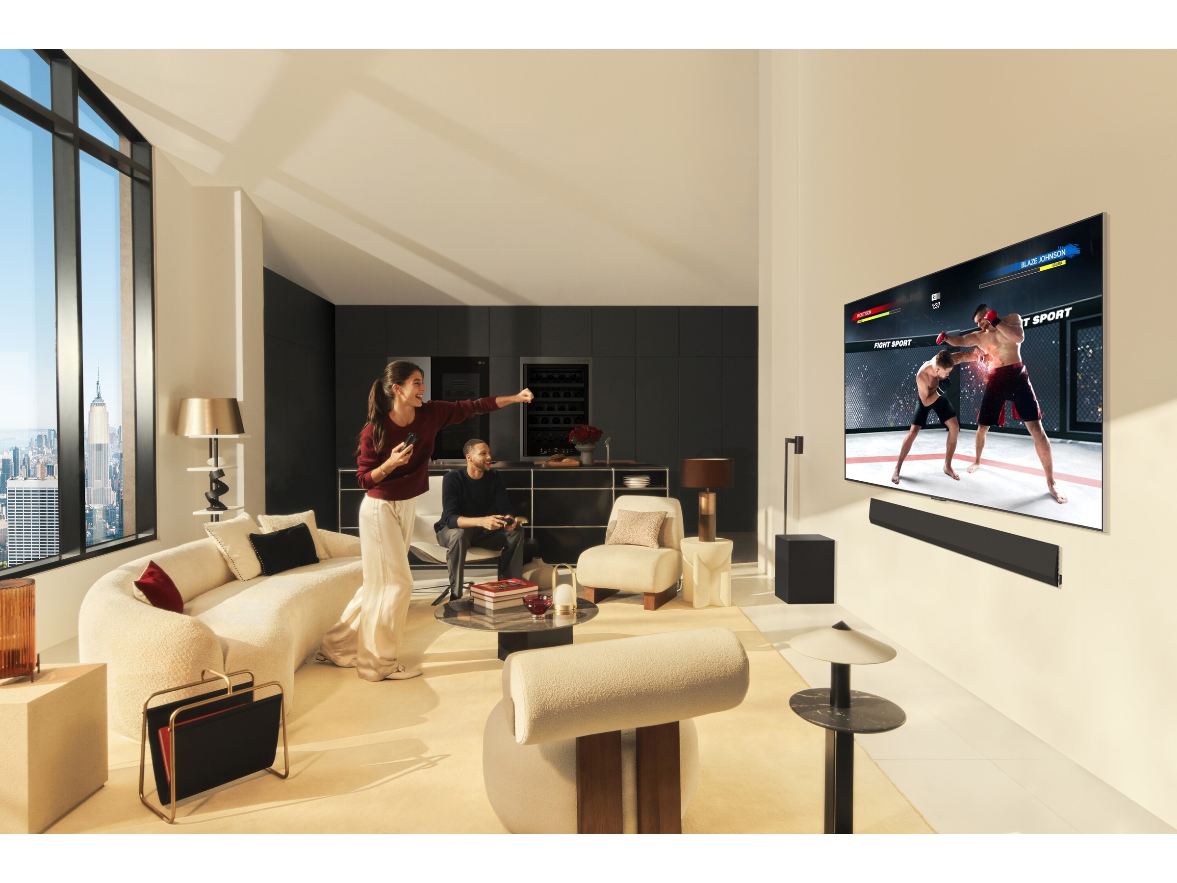 Ytterligare funktioner Inbyggt WOWCAST, Apt-X-teknik, Kompatibel med WiSA-högtalare, Bluetooth-surround klar, Simultaneous Audio, Down-firing Speaker, α11 AI Sound Pro, AI voice remastering, Virtual 11.1.2 Up-mix, LG Sound Sync, WOW-gränssnitt, Snabb medieväxling (QMS), WOW-orkester, AI Acoustic Tuning, Delat tv-ljudläge, Enhanced Audio Return Channel (eARC), Clear Voice Pro-teknik