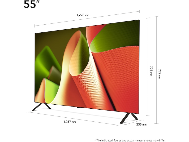 Skärm utan ställ - 122.8 cm x 4.59 cm x 70.8 cm x 14.3 kg, Skärm med ställ - 122.8 cm x 23.5 cm x 77.2 cm x 14.5 kg