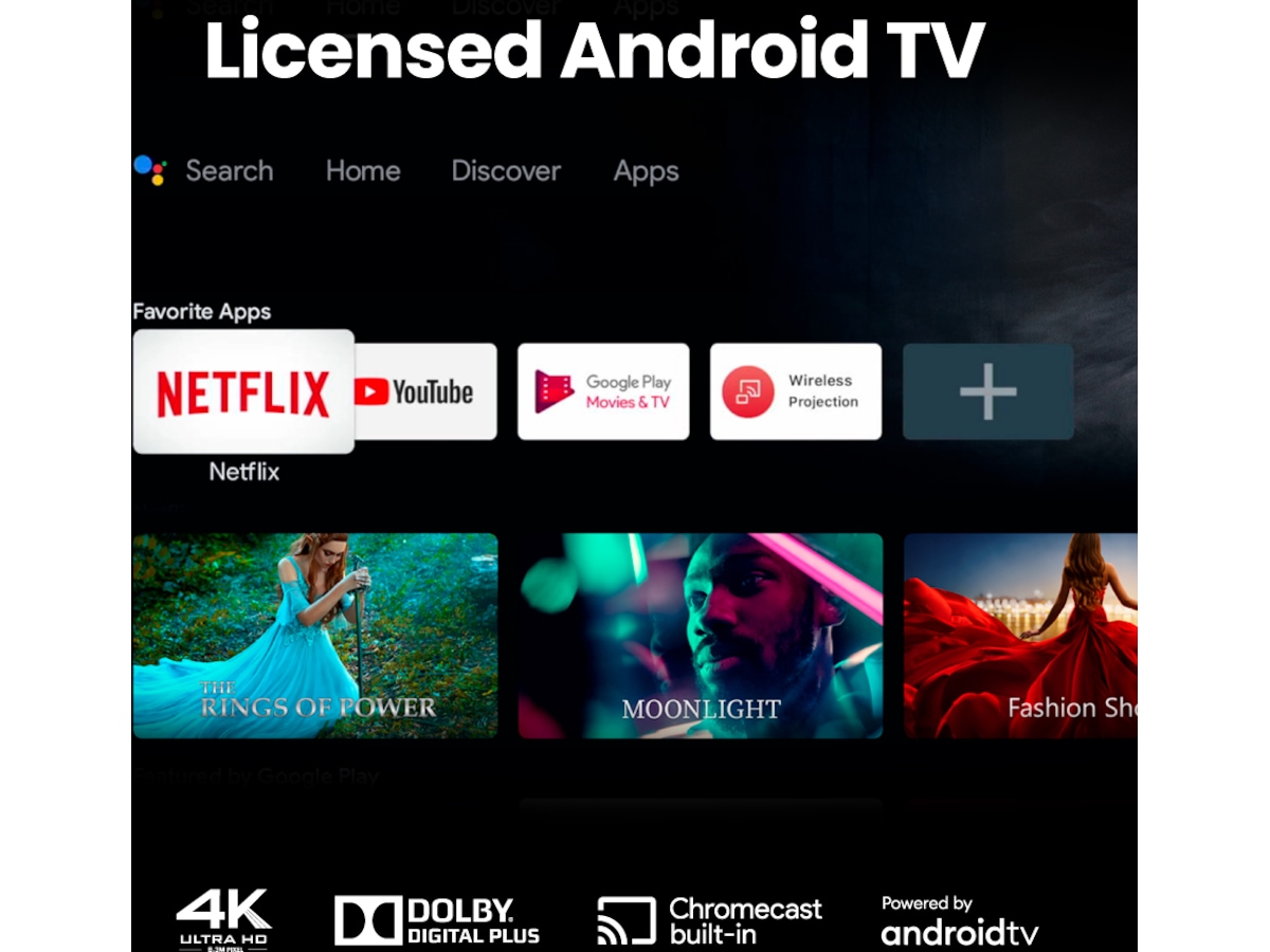 ALLT-I-ETT UNDERHÅLLNINGSHUB : Njut av oändlig underhållning med Google-certifierad Android TV. Sänd enkelt från iPhone/iPad/Mac, Android och PC-enheter med AirPlay och Chromecast.