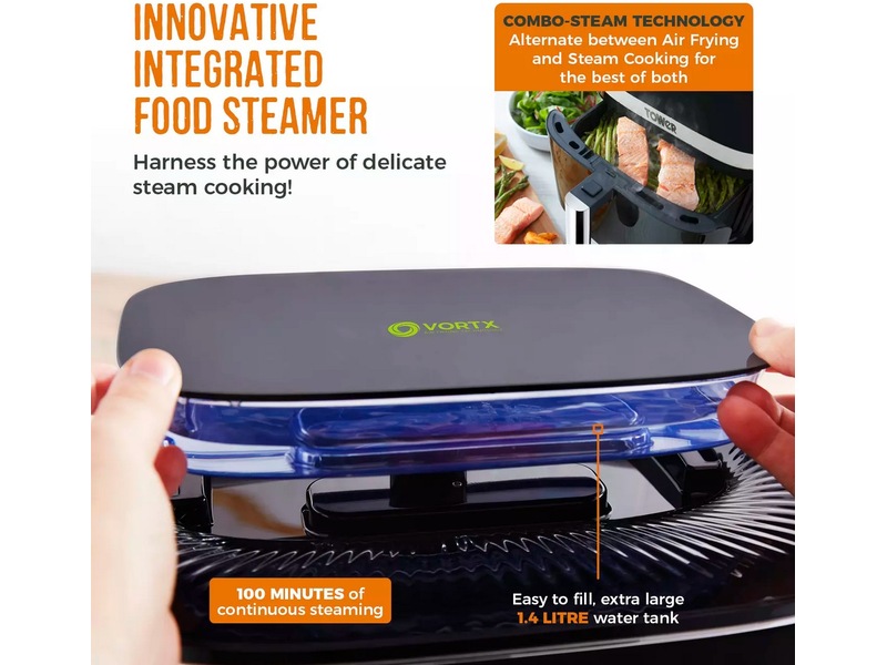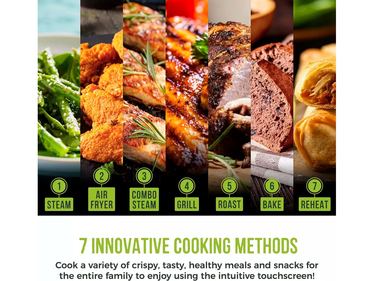 Air fry, ångkoka eller bekvämt kombinerad tillagning med luftfritering och ångkokning samtidigt. Ytterligare funktioner inkluderar återuppvärmning och ångrengöring.