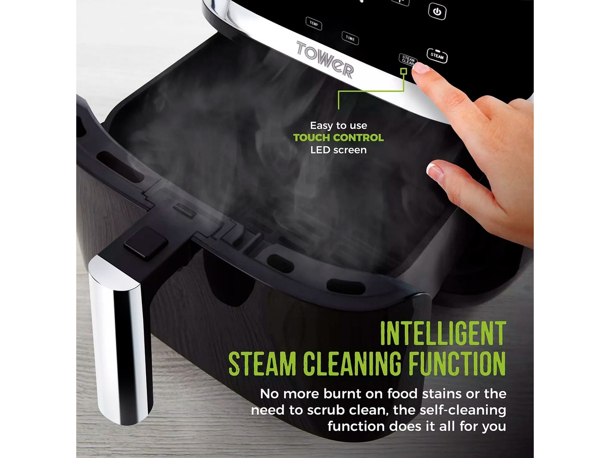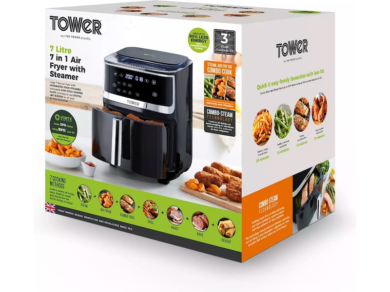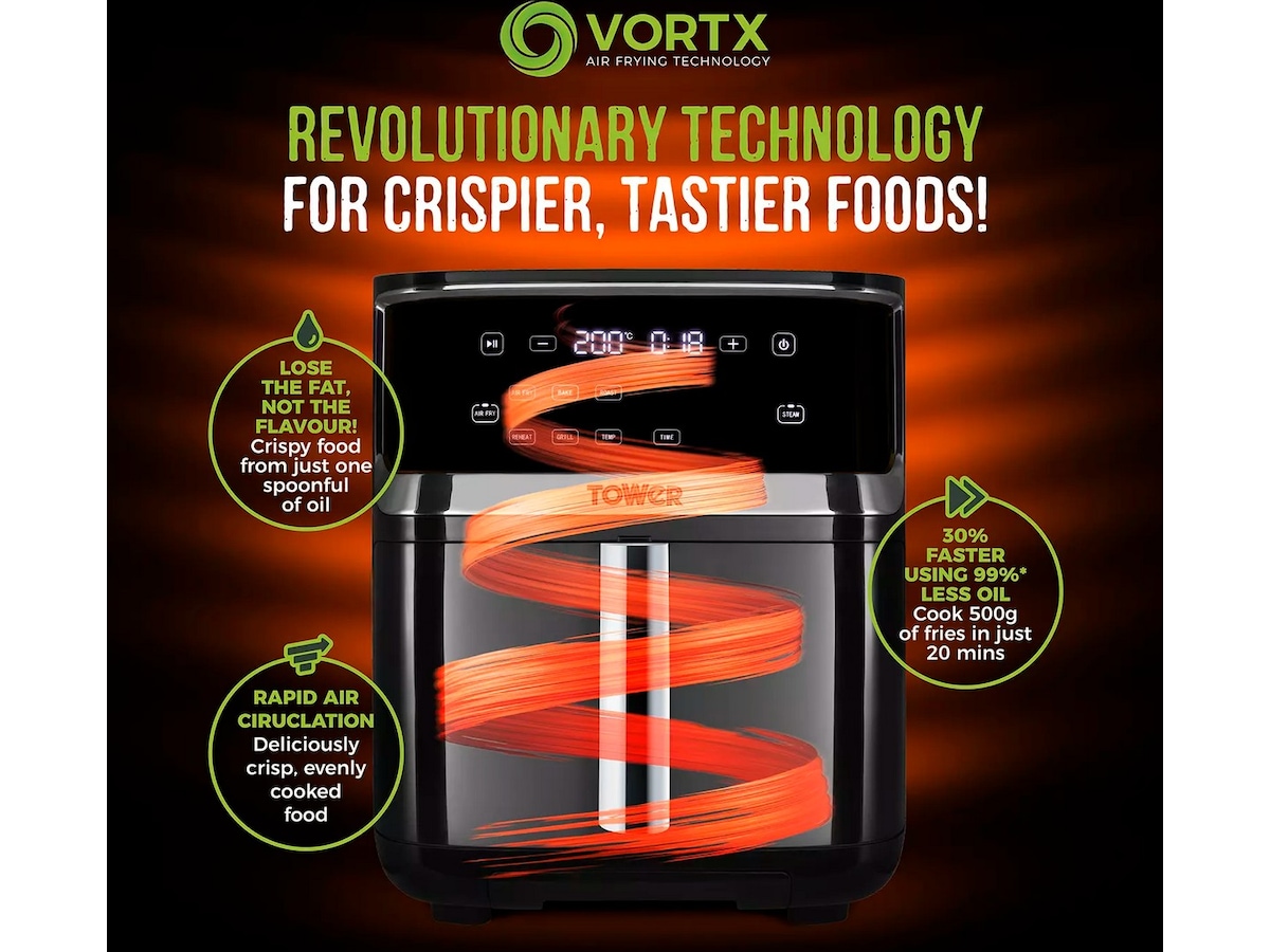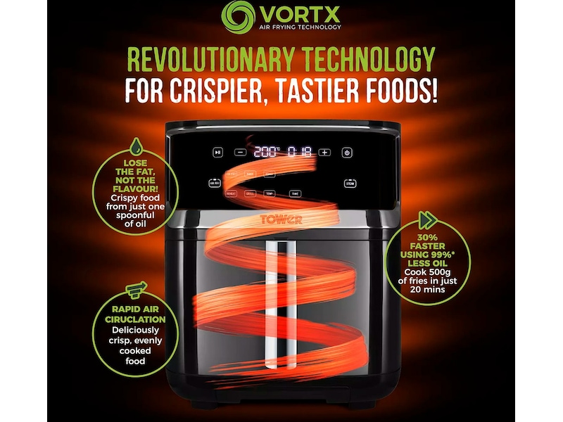 Att laga mat 30 % snabbare, Tower Steam Air Fryer använder mindre ström än konventionella ugnar. Spara upp till 50 % på din energi genom att helt enkelt byta till matlagning med ångfritös.