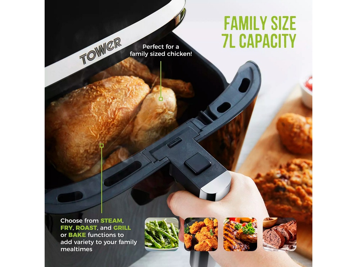 Välj mellan ång-, stek-, stek- och grill- eller bakfunktioner för att skapa variation till din familjs måltider. Den generösa kapaciteten på 7 liter passar en hel kyckling eller en hel kyckling, vilket sparar tid när du lagar en söndagsmiddag för hela familjen.