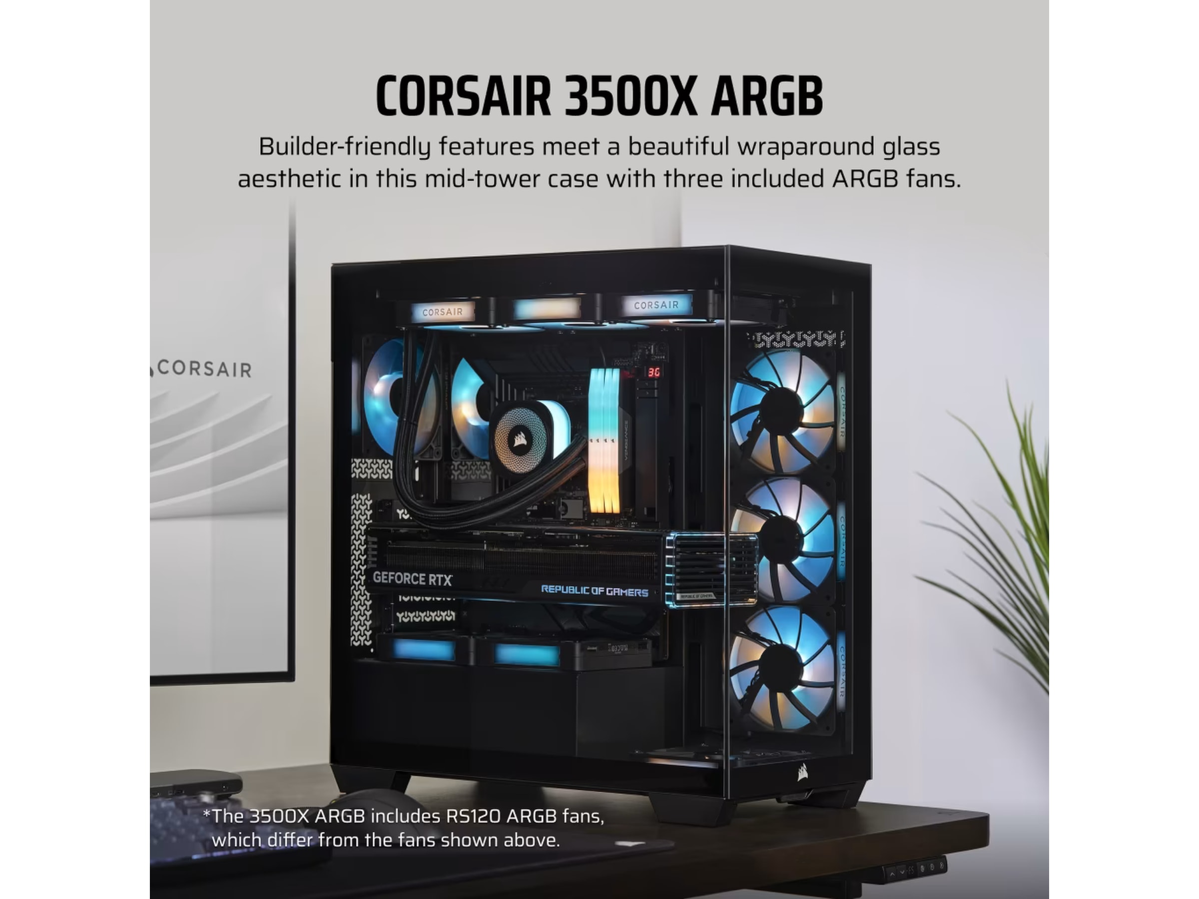 CORSAIR 3500X ARGB Mid-Tower Glass PC-fodral kombinerar byggvänliga funktioner med en fantastisk omslutande glasestetik och tre förinstallerade RS120 ARGB-fläktar.