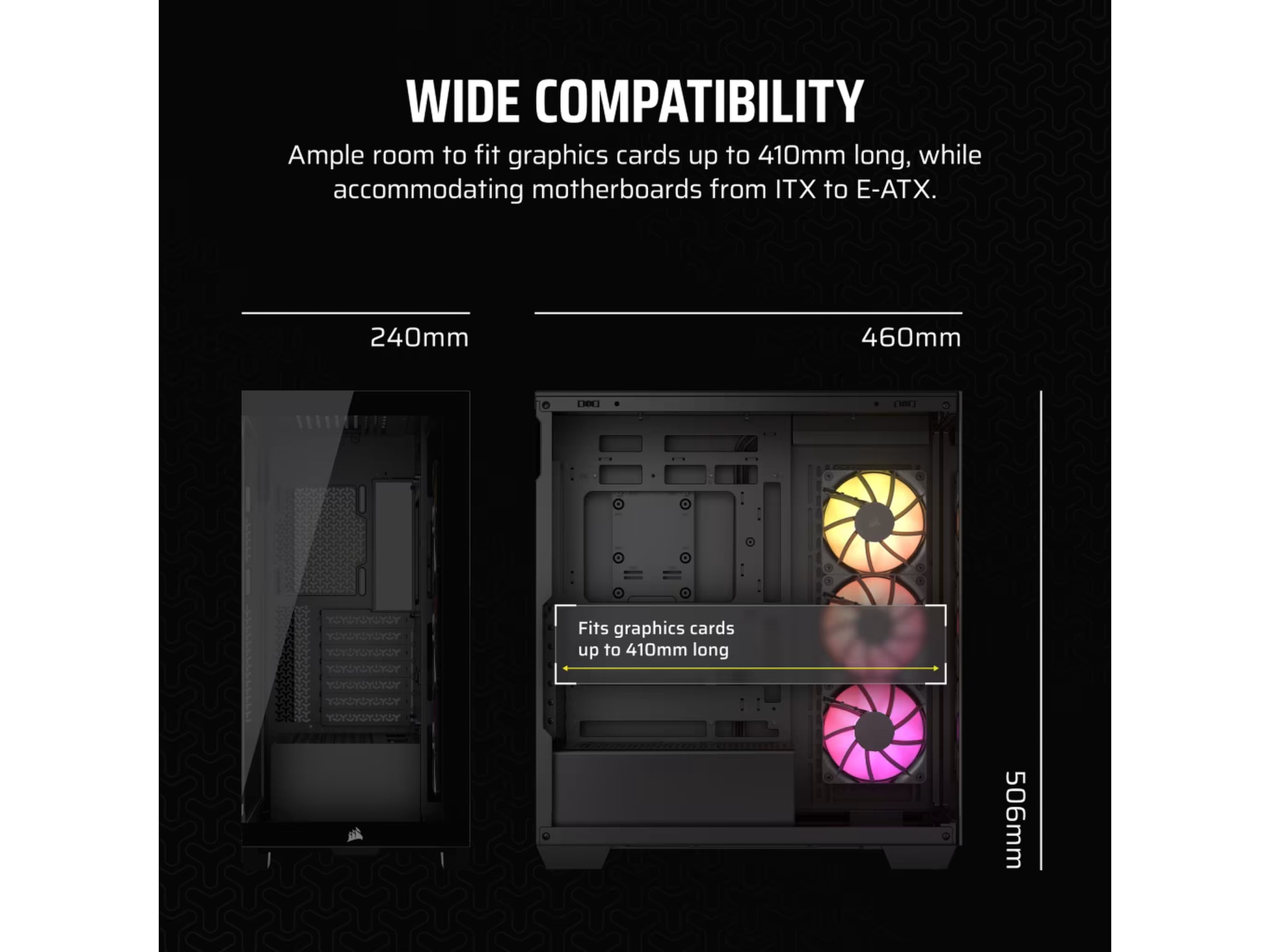 Du behöver inte ett stort fotavtryck för att bygga en utsmyckad dator. 3500X rymmer de flesta stora grafikkort och CPU-kylare, 360 mm radiatorer och till och med EATX-moderkort – utan att ta upp hela skrivbordet.