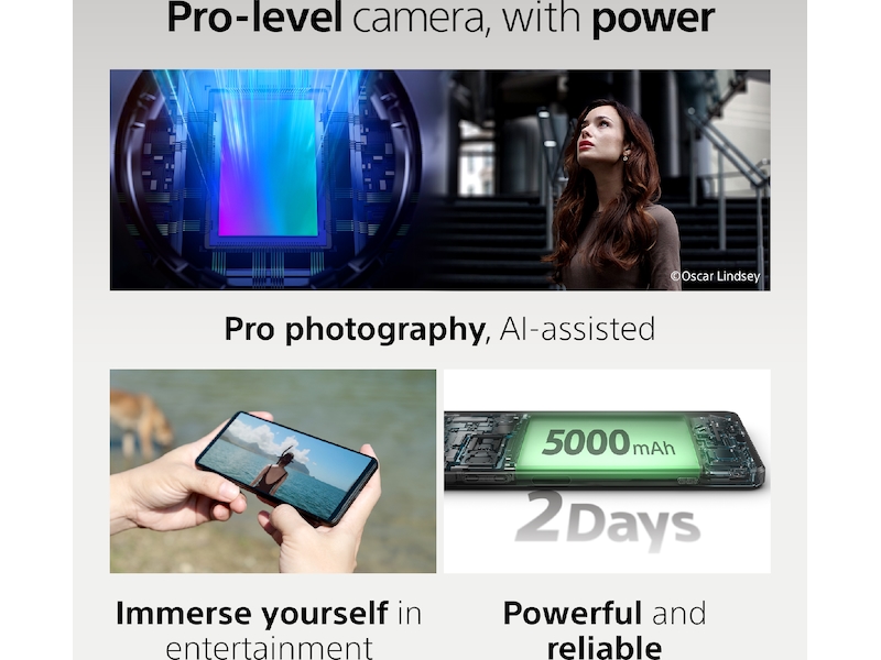 Otroligt nog är den nya skärmen 1,5 gånger ljusare än den tidigare modellen. Den nya Sunlight Vision-funktionen på vår senaste Sony-telefon hanterar skärmens synlighet i ljusa miljöer, och gör inte bara bilden ljusare, utan utför även AI-bildbehandling för att förhindra överexponerade högdagrar genom att analysera bilderna och omgivande ljusstyrka i realtid.