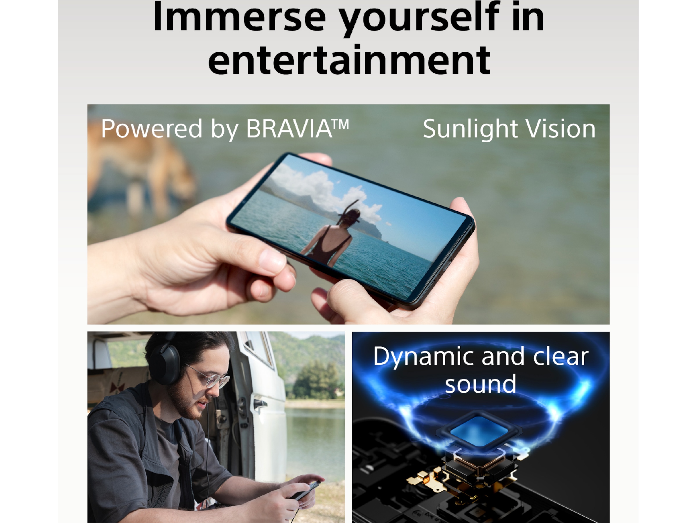 Otroligt nog är den nya skärmen 1,5 gånger ljusare än den tidigare modellen. Den nya Sunlight Vision-funktionen på vår senaste Sony-telefon hanterar skärmens synlighet i ljusa miljöer, och gör inte bara bilden ljusare, utan utför även AI-bildbehandling för att förhindra överexponerade högdagrar genom att analysera bilderna och omgivande ljusstyrka i realtid.
