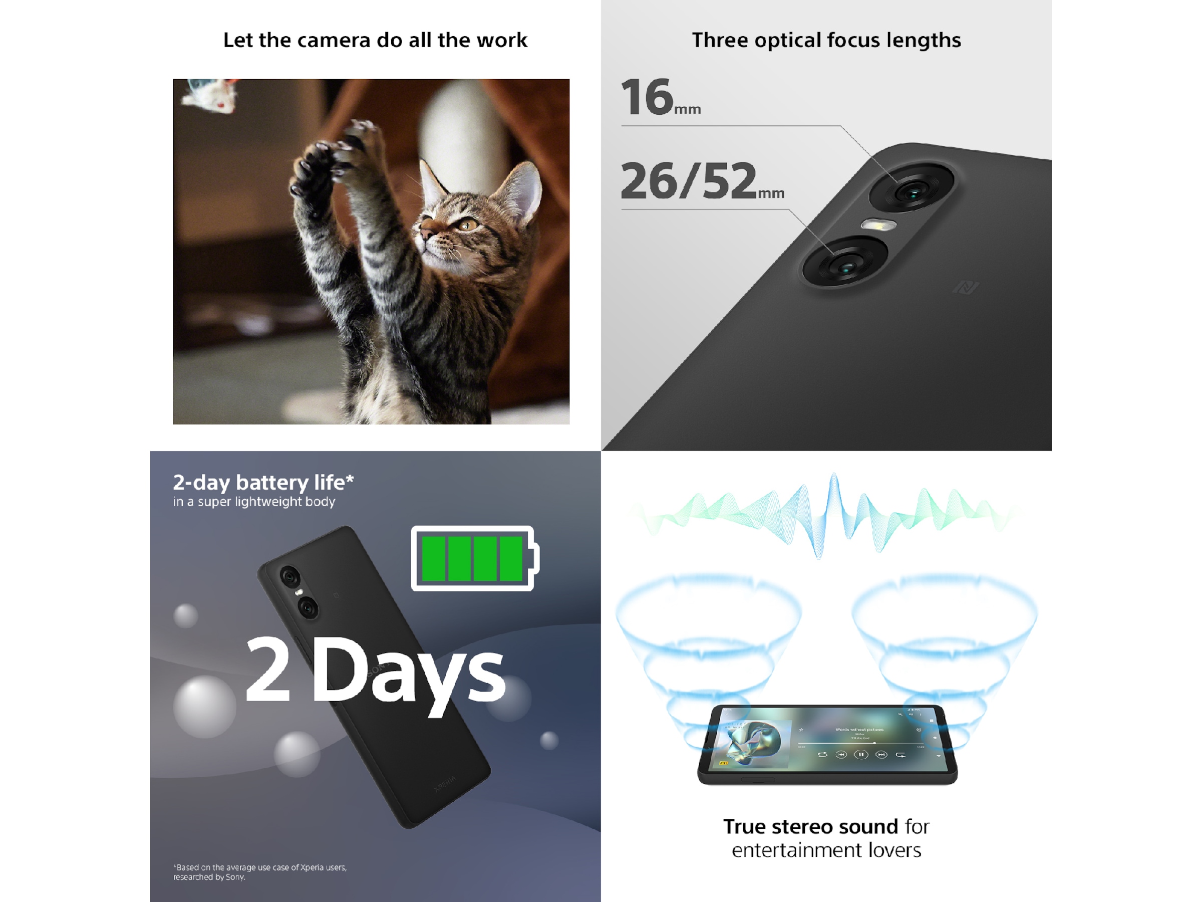 Med ett 5000 mAh batteri kan du glömma att få slut på ström! Xperia 10 VI har tillräckligt med batteri för att hålla i två dagar. Det finns mer än tillräckligt att se, lyssna och ta bilder varje dag. I kombination med den superlätta och kompakta kroppen är denna smartphone från Sony den perfekta enheten att bära med sig i vardagen.