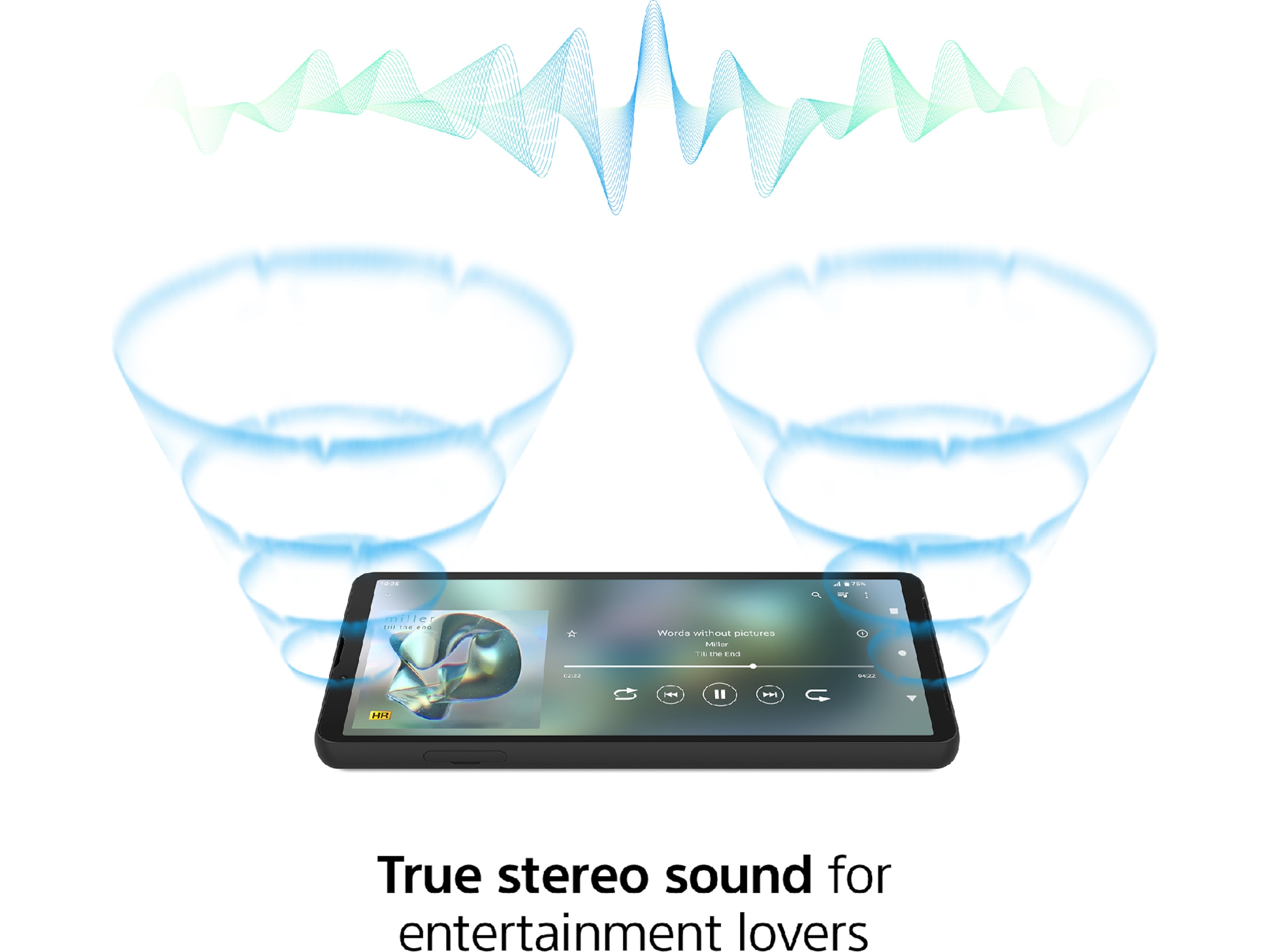 Xperia 10 VI:s främre stereohögtalare återger nu starkare och klarare ljud än någonsin tidigare, vilket ger en mer uppslukande lyssningsupplevelse.