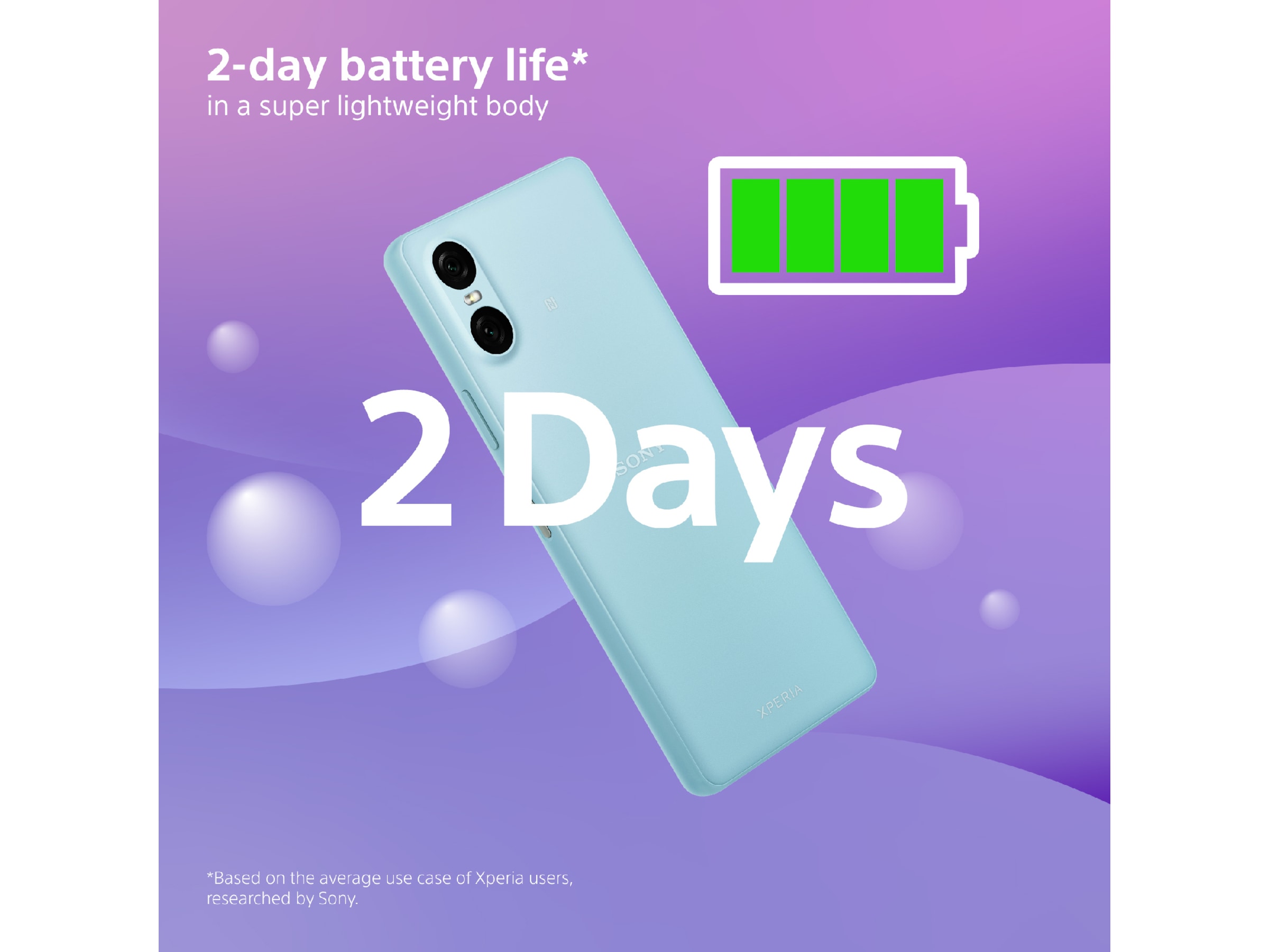 * Resultaten av tester utförda av Sony under följande förhållanden: 360 minuters daglig användning för webbsurfning, videouppspelning, spel och andra funktioner, med 1080 minuters passningstid, baserat på en median Xperia-användares batterianvändningsprofil. Faktisk batteriprestanda kan variera beroende på användning och miljö.