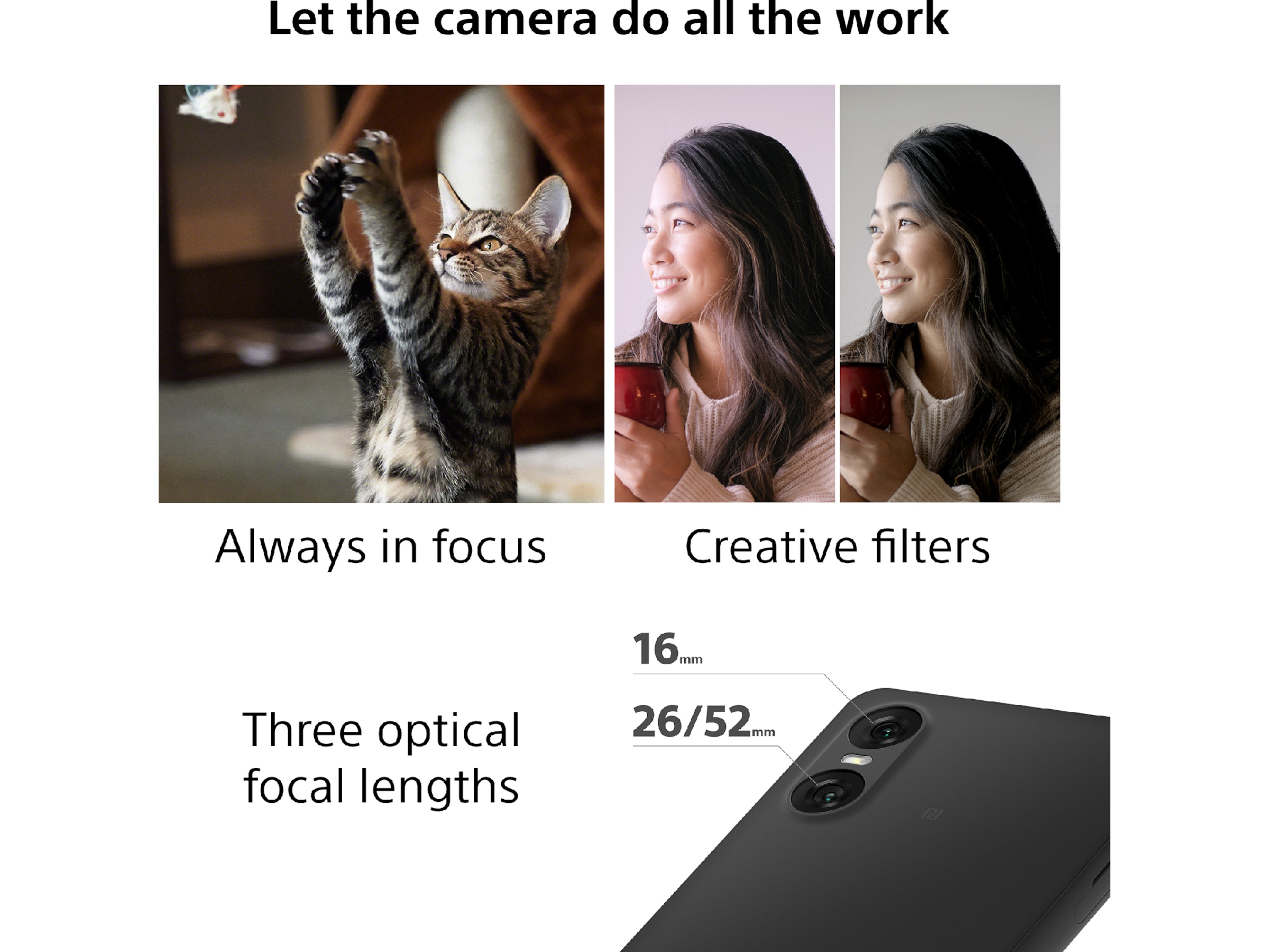 När du ser en fotomöjlighet vill du inte missa ögonblicket genom att välja inställningar. Denna Sony-mobiltelefon gör det lätt att använda AI-teknik för motiv-, tillstånds- och motivigenkänning som automatiskt väljer de idealiska inställningarna för bästa bilden.