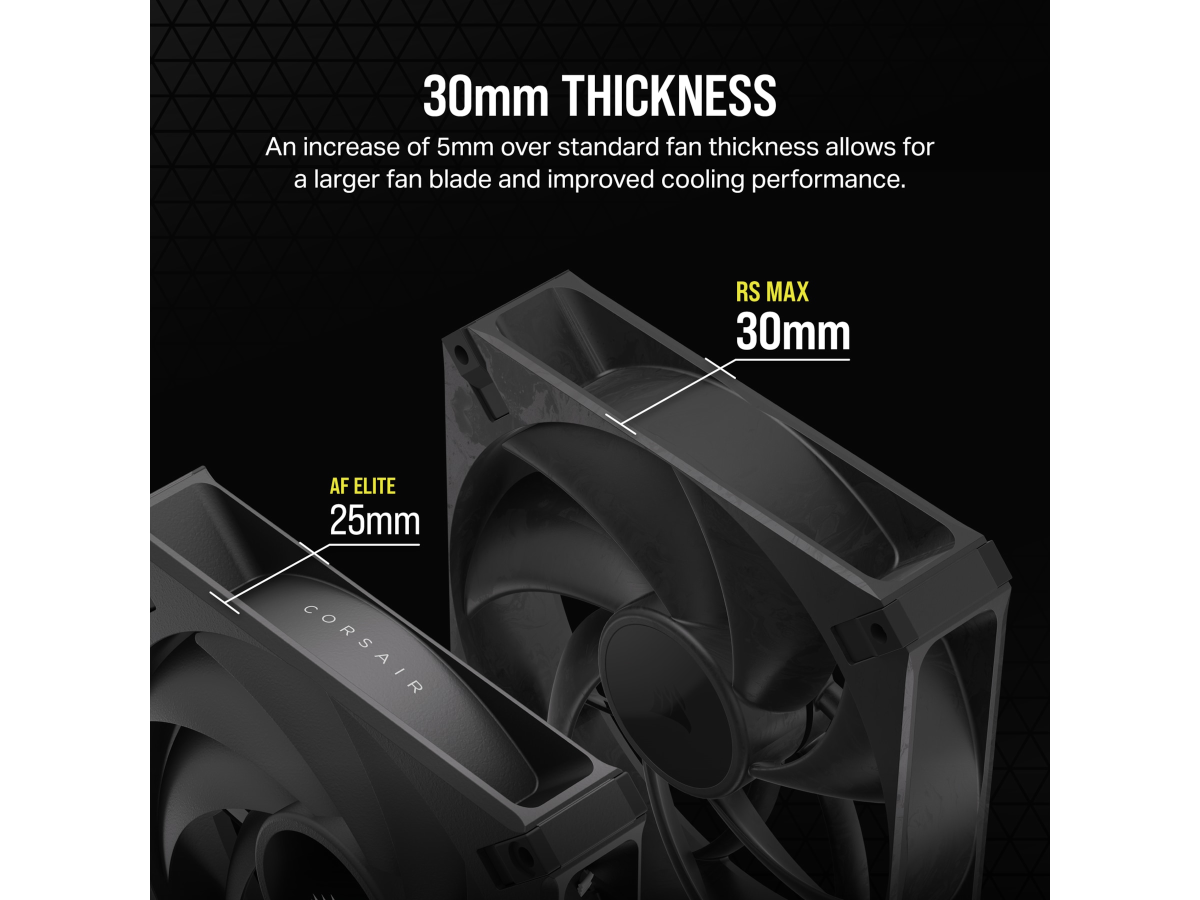 CORSAIR RS140 MAX PWM tjock fläkt maximerar din kylning med en extra fläkt för ditt system. Med en tjocklek på 30 mm – 5 mm mer än vanliga fläktar – har RS140 MAX ett större fläktblad och en markant förbättring av kylprestanda. RS140 MAX-fläktar har en 4-stifts PWM-header för att möjliggöra exakt kontroll över dina fläkthastigheter, som når upp till 1 600 RPM samtidigt som de trycker upp till 104 CFM luft och säkerställer att din dator förblir sval oavsett systemkrav. Tack vare sin ökade tjocklek, uppnår RS140 MAX ett anmärkningsvärt högt statiskt tryck upp till 2,4 mm-H2O, vilket effektivt trycker luft genom hinder i ditt fall, såsom radiatorer med hög densitet. RS140 MAX är byggd med flytande kristallpolymer (LCP), känd för sin exceptionella styrka och styvhet. Detta förstklassiga materialval dämpar bladvibrationer, vilket bidrar till optimal prestanda och hållbarhet. CORSAIRs AirGuide-teknologi använder antivirvelvingar på fläktbladet för att kanalisera luftflödet i en tät kon, vilket säkerställer att din kylning riktas mot de komponenter som behöver det mest. Dessutom hjälper CORSAIRs Magnetic Dome-lager till att minimera buller och friktion, vilket resulterar i både tyst drift och längre livslängd.