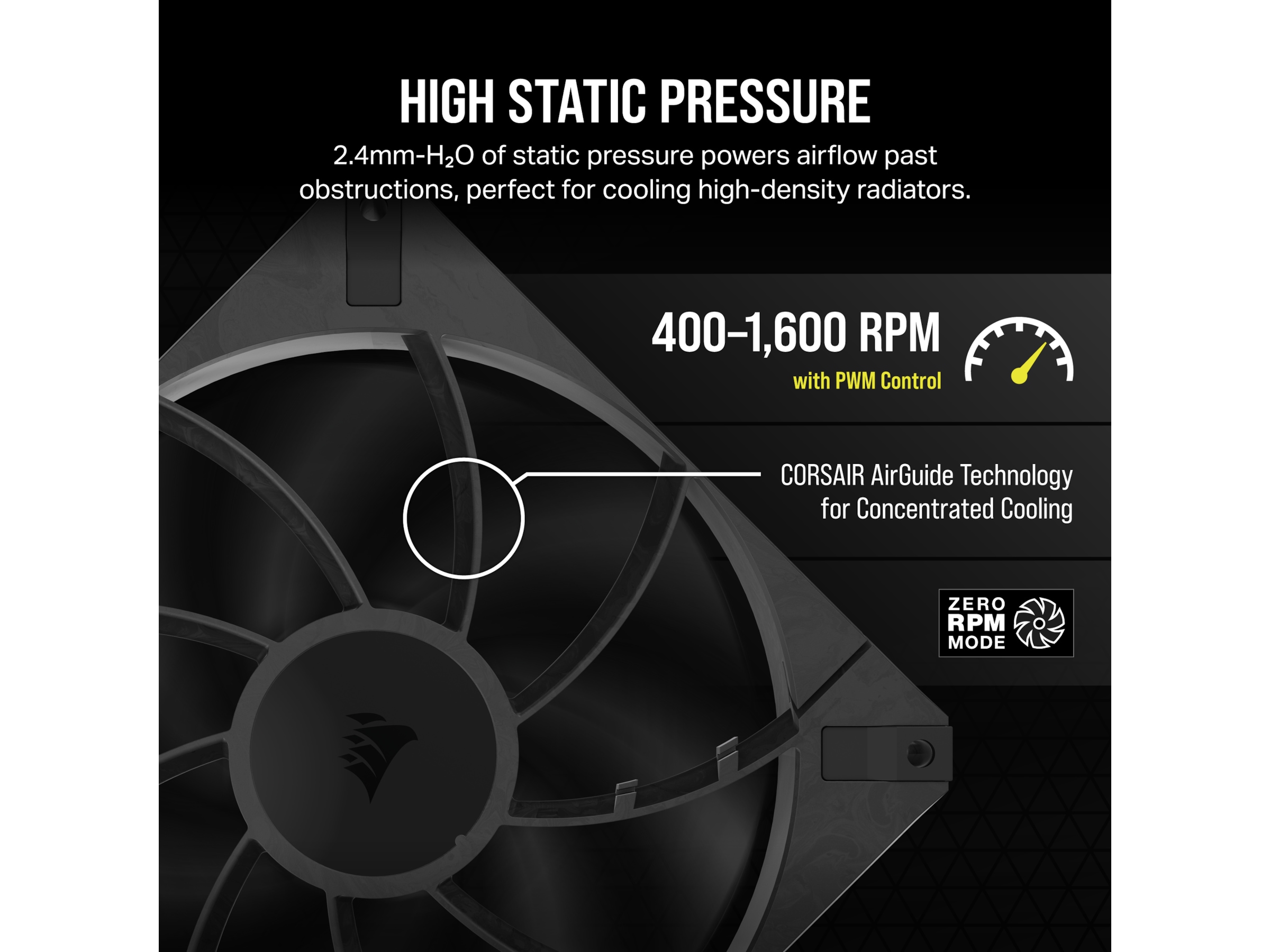 - CORSAIR AirGuide-teknik: Antivirvelvingar riktar luftflödet mot dina hetaste komponenter för koncentrerad kylning, oavsett om de används för insug, avgaser eller monterade på en kylare eller kylfläns.