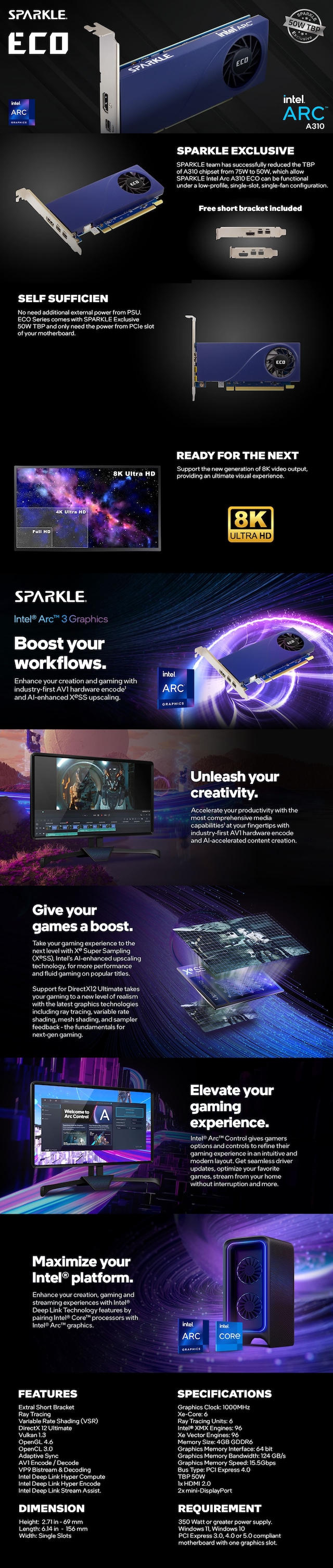 Variable rate shading (VRS), Intel Deep Link Hyper Compute, Intel Deep Link Hyper Encode, Singel-fläkt, 6 raytracingenheter, Stöd för AV1-avkodning, Intel Deep Link Stream Assist, Ray Tracing, Stöd för AV1-kodning, 6 Xe-kärnor, VP9-stöd, Enkel plats med halv höjd, 96 Xe vektormotorer, 96 Intel XMX-motorer