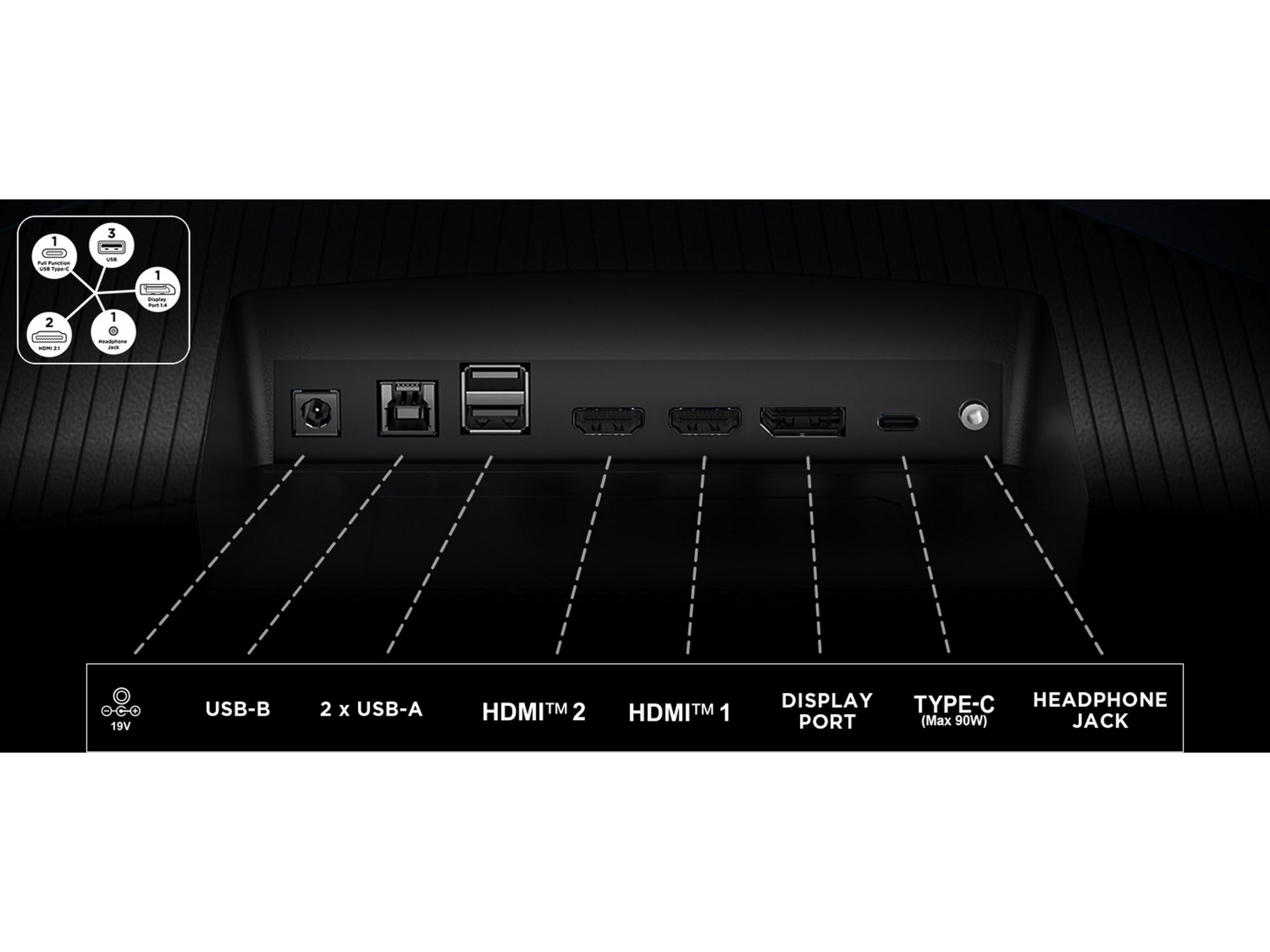 DisplayPort 1.4, Hörlurar, 2 x USB 3.0 (Typ A), USB 3.0 (Typ B), USB-C/DisplayPort 1,4 Alt-läge med strömleverans (ström upp till 90W), 2 x HDMI |
