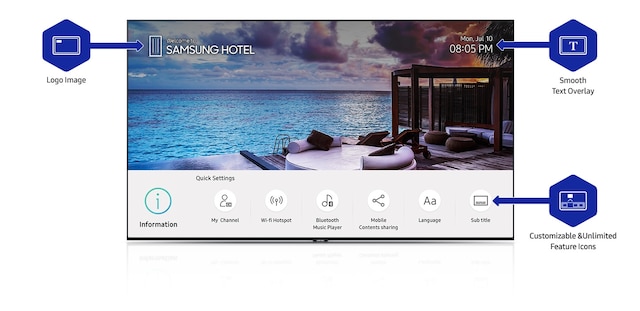 Varje Samsung-hotellskärm har en intuitiv, anpassningsbar startmeny som effektiviserar utbytet av innehåll mellan hotell och gäster. De som hanterar innehållet kan infoga bilder, logotyper och funktionella symboler som möter gästernas specifika behov och samtidigt stärka specialerbjudanden och hotellens varumärkesprofil