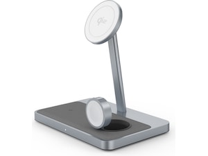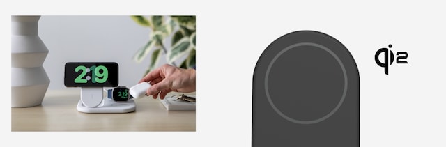 Ladda dina nödvändigheter med ett ultrabekvämt hopfällbart stativ. Den levererar 15W snabb trådlös laddning till din iPhone 16/15/14/13/12, 5W till din Apple Watch och 5W till dina AirPods. Med hjälp av Qi2-tekniken kan du placera din iPhone på laddningsplattan för en säker, magnetisk anslutning.