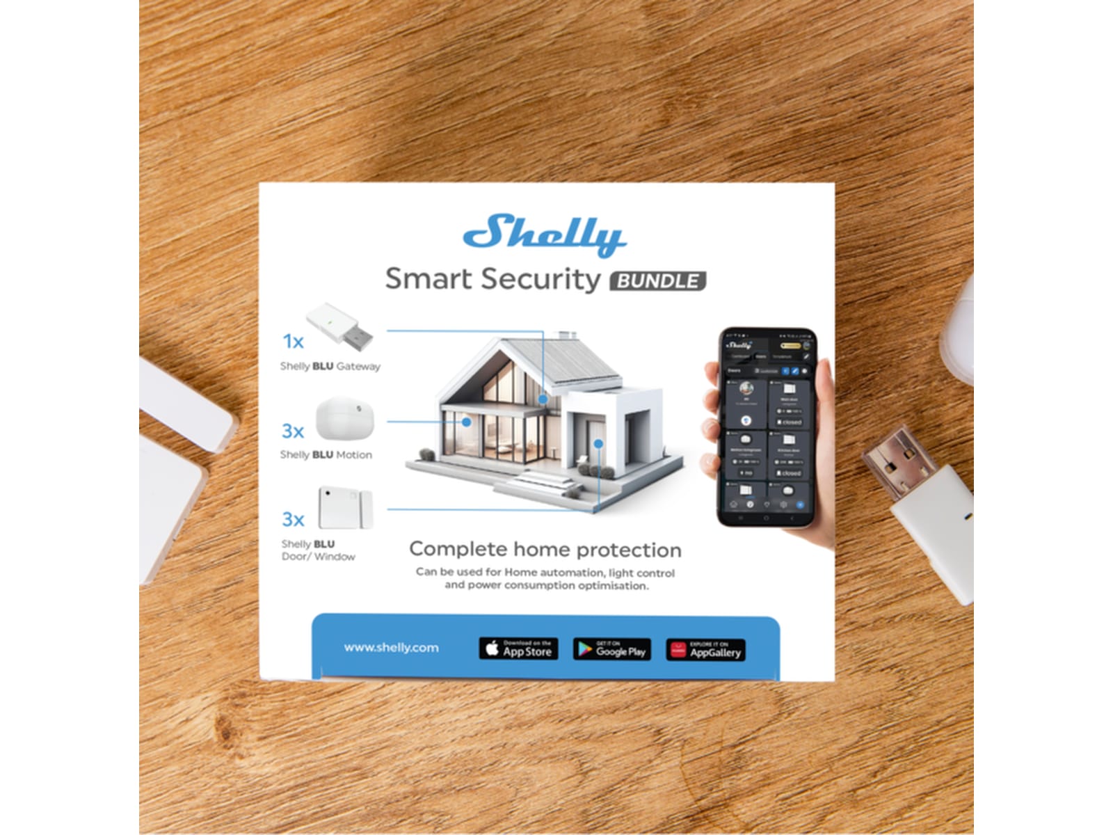 - Paketet inkluderar Bluetooth-enheter: 3xShelly BLU Door/Window, 3xShelly BLU Motion, 1xShelly BLU Gateway