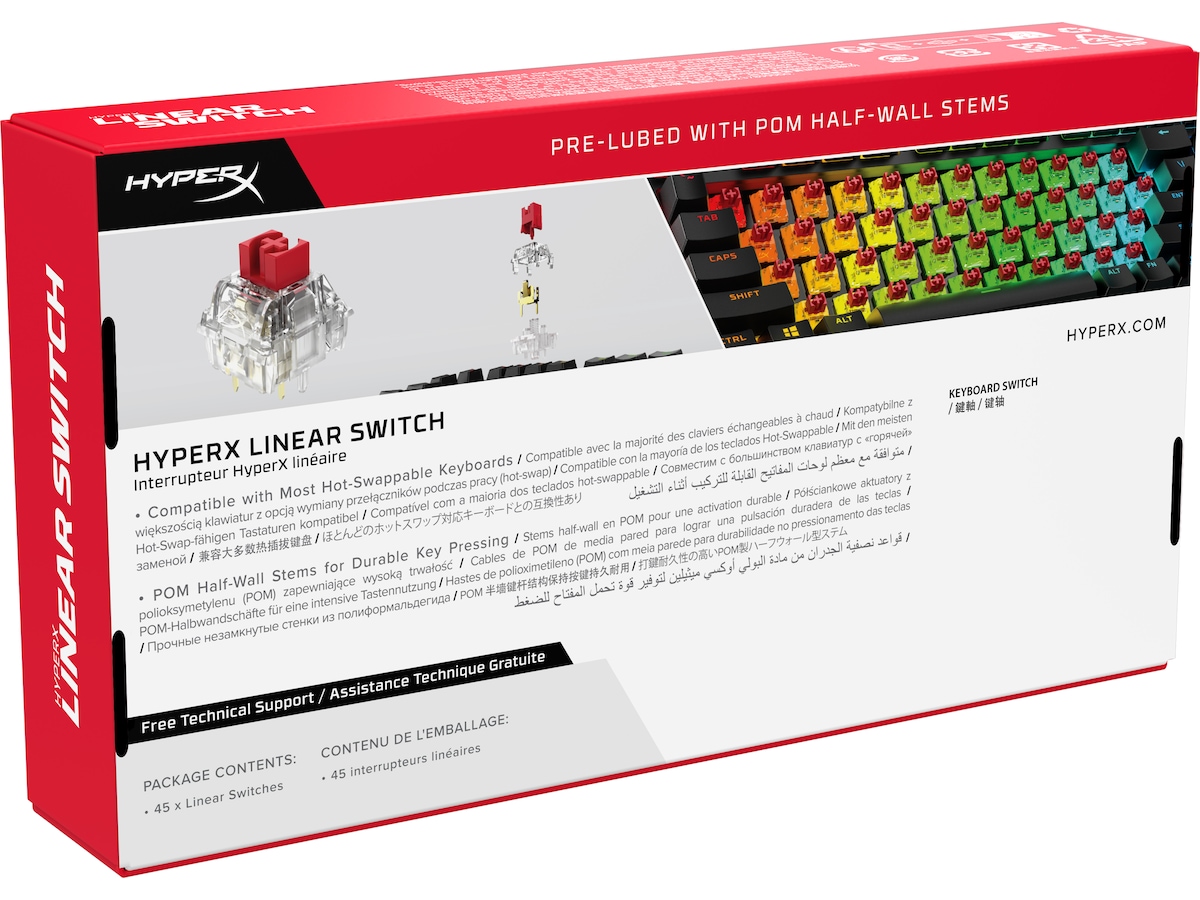 Med 40 g aktiveringskraft och en kort 1,8 mm aktiveringssträcka är HyperX Linear Switches optimerade för gaming på hög nivå.