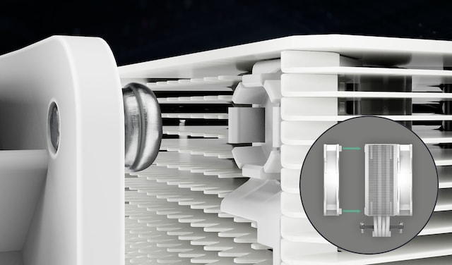 Kylflänsens fenor är öppna på sidan och låter dragfläkten dra ut ytterligare kall luft ur PC-fodralet genom kylflänsen. Denna sidoflödesdesign uppnår ännu effektivare ventilation.