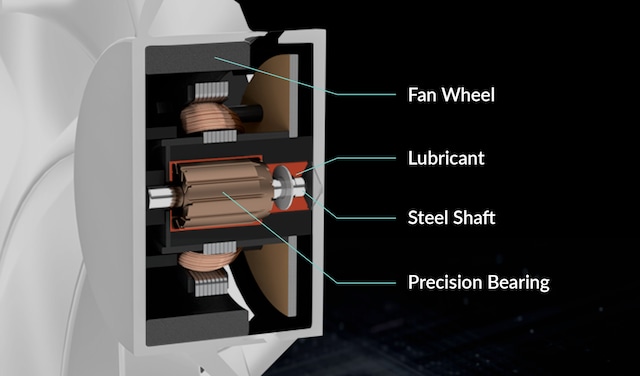 Tack vare en kombination av legering och smörjmedel utvecklad i Tyskland minimeras friktionen i lagret och högre effektivitet uppnås. Förutom att förhindra förlust av smörjmedel, minimeras slitaget på stift och hylsa. På så sätt genereras mindre värme, mindre lagerljud produceras och fläktens livslängd förlängs avsevärt.