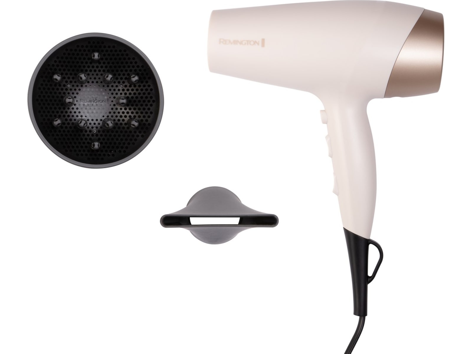 Bra hår börjar med ett vackert snyggt utseende och en naturligt mjuk känsla. Remington Shea Soft Hairdryer har mikrokonditioneringsmedel berikade med Shea Oil som släpps ut i luftflödet för att lämna håret ljuvligt mjukt och smidigt. Den joniska teknologin minskar statisk elektricitet för att eliminera frizz för en flyktfri finish. En diffusertillbehör förstärker hårets naturliga form och uppmuntrar till bekymmersfria lockar medan den breda torkkoncentratorn riktar luftflödet för att öka lufthastigheten för snabba föningsresultat.