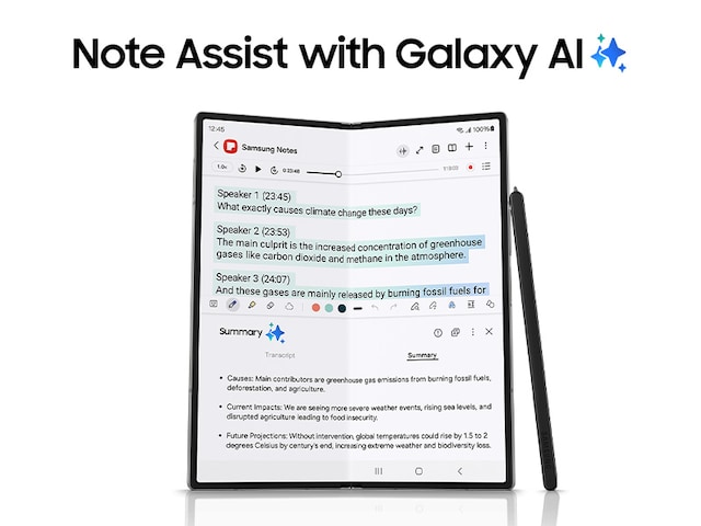 Det enklaste sättet att sammanfatta anteckningar om Samsung hopfällbara. Få föreläsningsanteckningar med bara några få tryck – även när du gör flera saker. Note Assist transkriberar inspelningar och organiserar dem i anteckningar, vilket ger effektiva sammanfattningar.* För allt annat finns S Pen, redo att göra underverk på den svepande skärmen.*