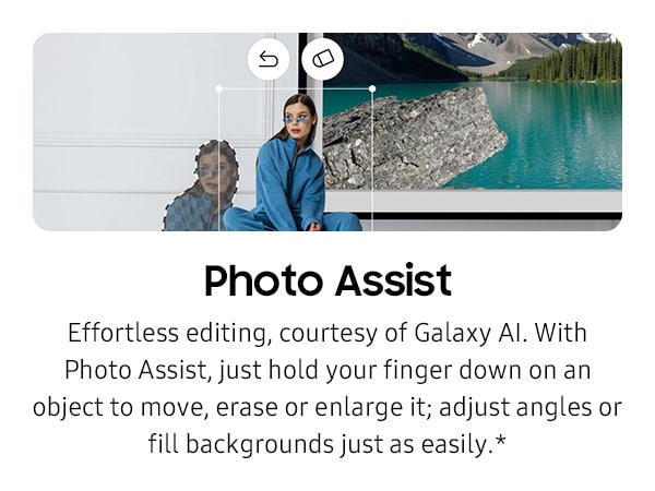 Enkel redigering, med tillstånd av Galaxy AI. Med Photo Assist håller du bara fingret på ett objekt för att flytta, radera eller förstora det; justera vinklar eller fyll bakgrunder lika enkelt.*