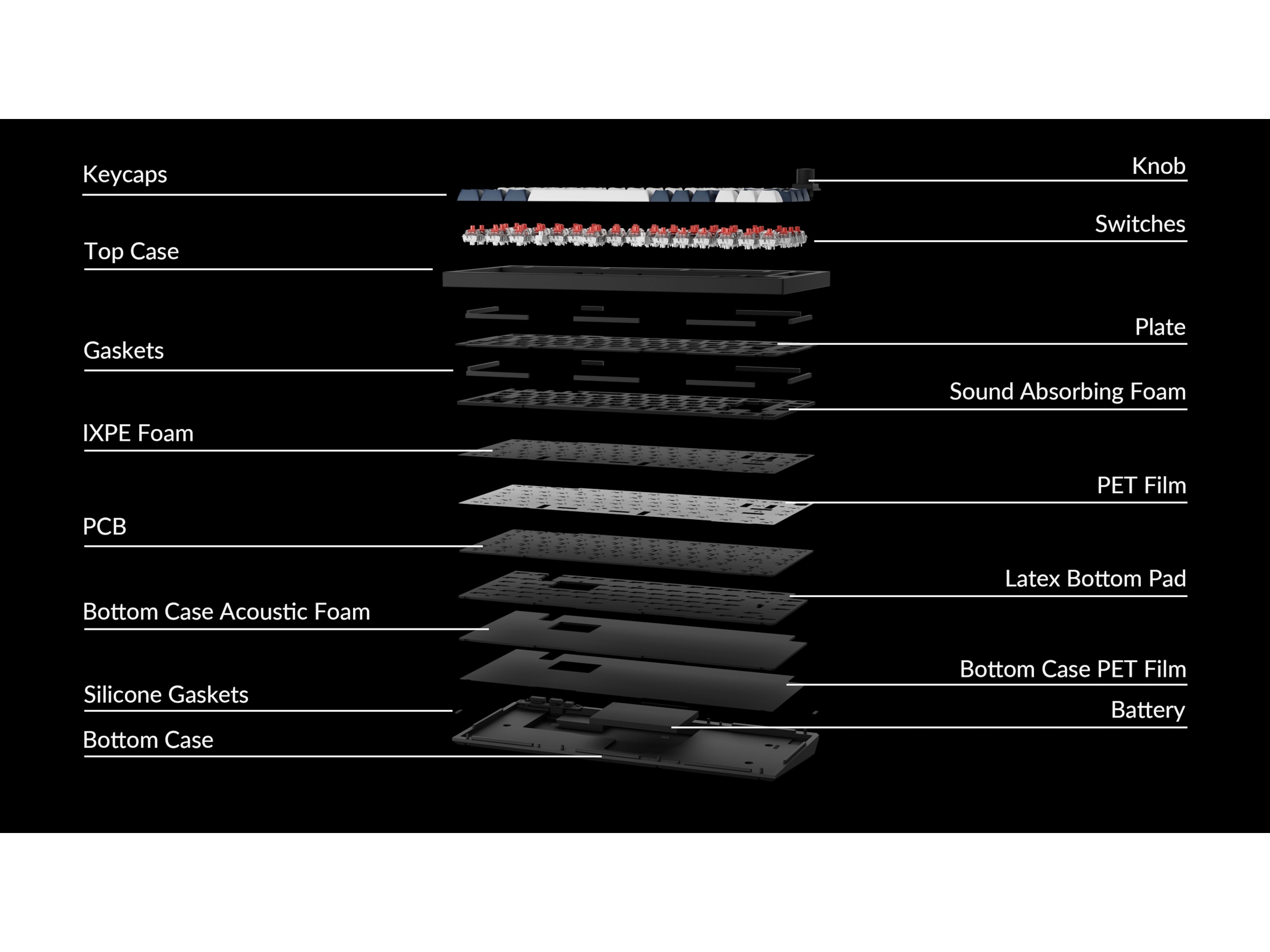 The Double Gasket Design is a new innovative structure in the industry. In addition to the gaskets on the plates, we added silicone pads between the top and bottom cases to significantly reduce the acoustic resonance between the metals and reduce the noise of the impacted metals.