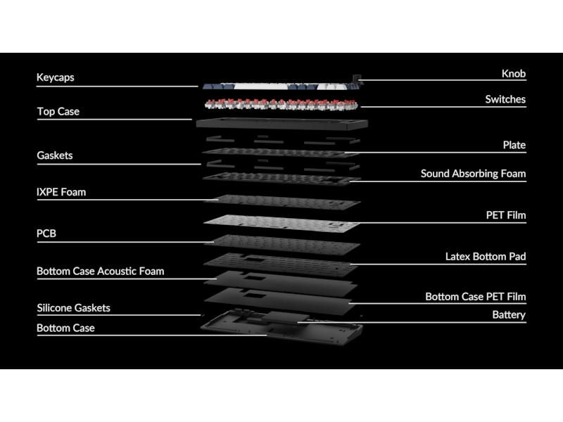 The Double Gasket Design is a new innovative structure in the industry. In addition to the gaskets on the plates, we added silicone pads between the top and bottom cases to significantly reduce the acoustic resonance between the metals and reduce the noise of the impacted metals.