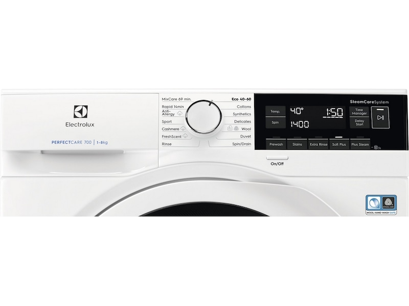 Skölj, Handtvätt, Snabb 14', Kashmirtvätt, SoftPlus-program, Antiallergiånga, Fläckprogram, Tömning + centrifugering, Ylle, FreshScent, Sportkläder, Extra sköljning, Eco 40-60, Syntet, MixCare, Fördisk, Bomull, PlusSteam |