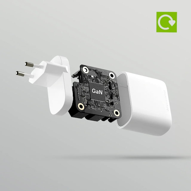 Integrerad GaN- eller galliumnitridteknik ger laddare som är kompakta men extremt kraftfulla utan överhettning. GaN-transistorer är inte bara mindre än de vanliga kiseltransistorerna, de bär också mer kraft. Effektivare energileverans innebär mindre spillvärme och lägre förbrukning.