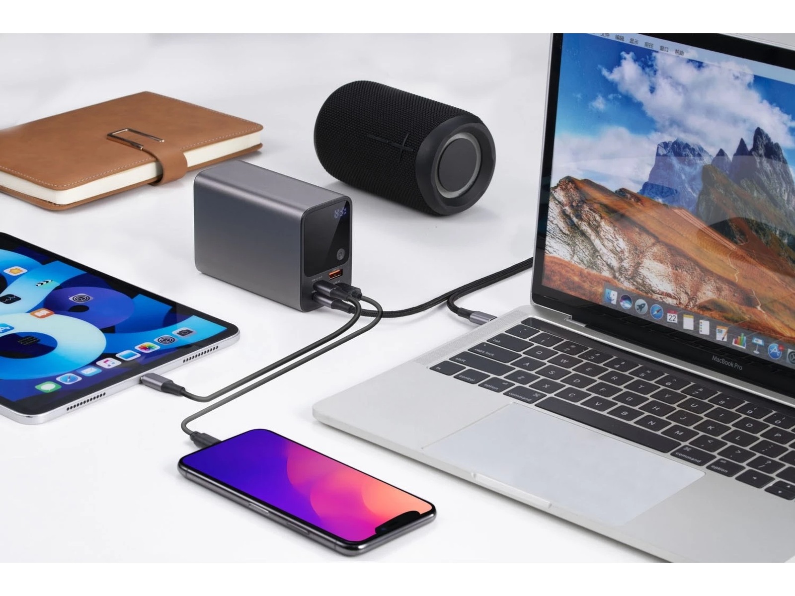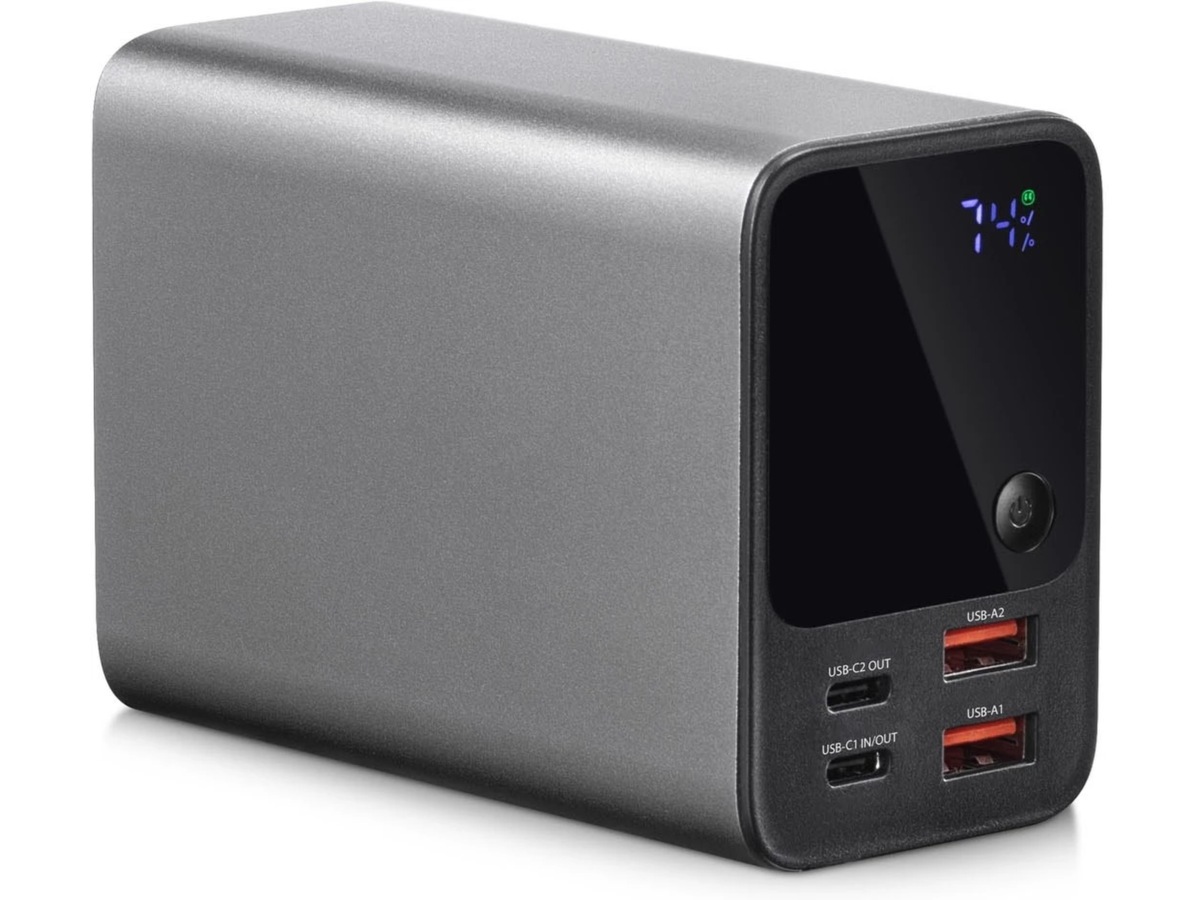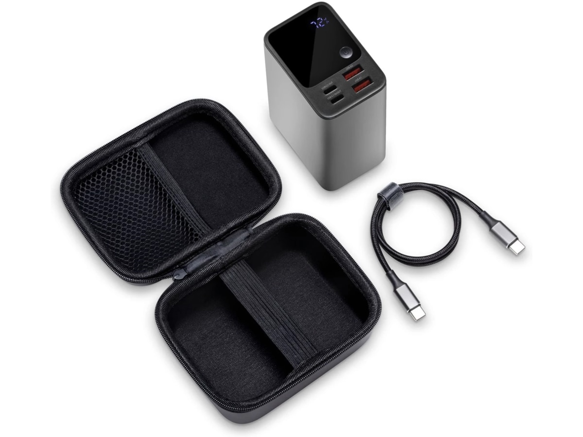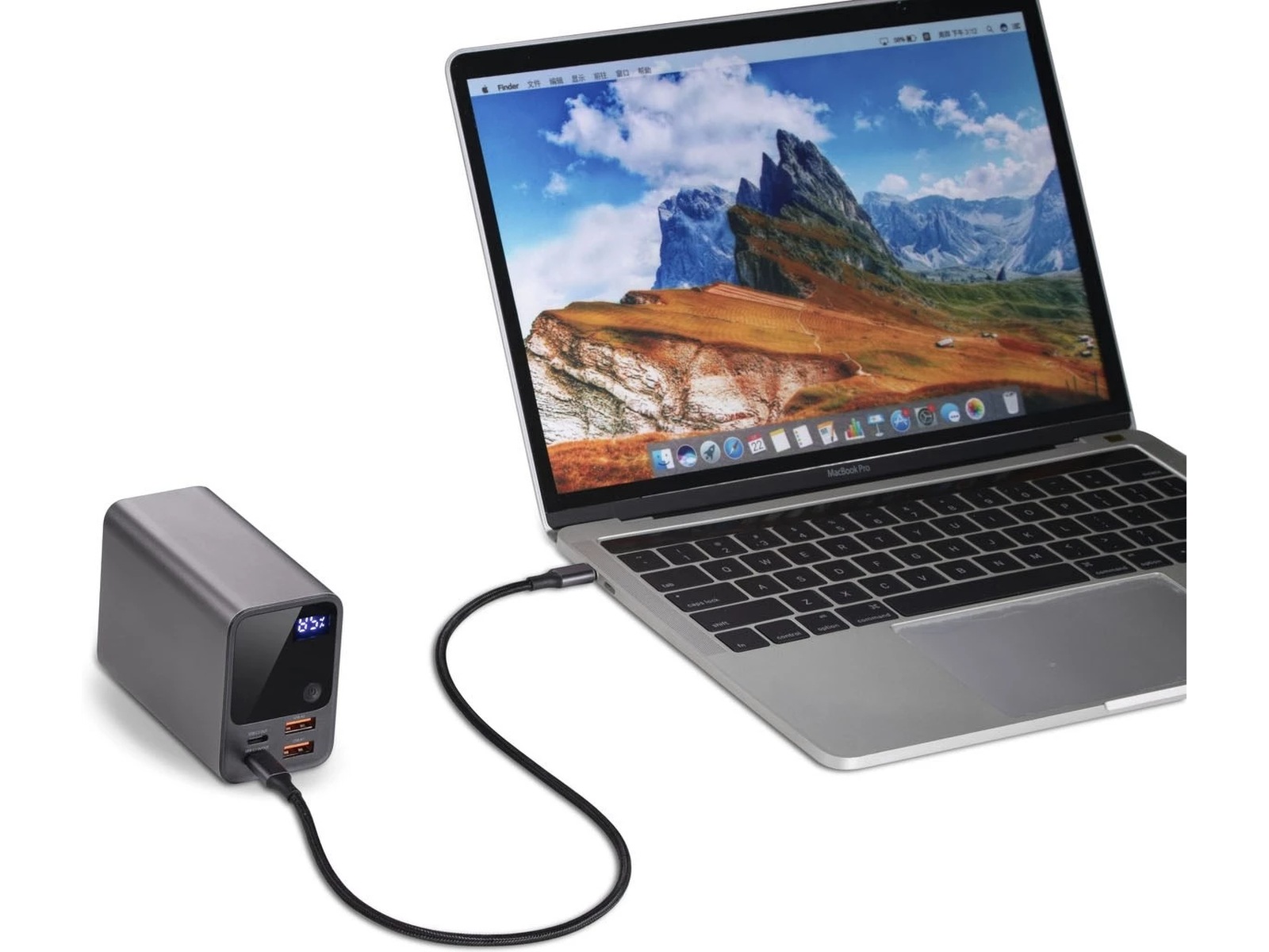 Nödladdaren laddas snabbt med 100W ingång, och kan laddas från tomt till fullt batteri på bara nittio minuter. En textilklädd USB-C-laddningskabel ingår i kartongen, så allt du behöver är en 100W väggladdare.