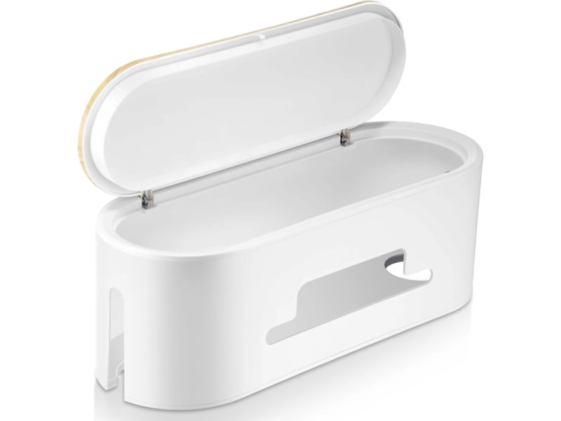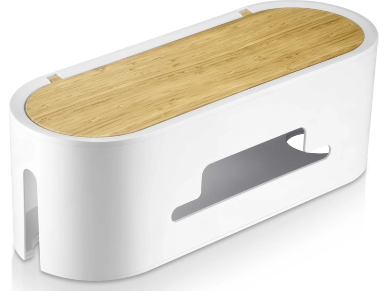 Kabelboxen passar perfekt på eller under skrivbordet, bredvid datorn eller nära TV:n. Du placerar helt enkelt strömfördelaren i lådan utan att koppla bort strömmen. Sedan lägger du ner alla sladdar i lådan och stänger locket. Klart! Den har hål för kablarna på båda kortsidorna, så du behöver inte dra kablarna runt lådan. Denna kabelbox är lämplig för kablar och strömdelare med upp till sex uttag. På undersidan har kabelboxen gummifötter så att den inte glider på golvet.