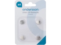 Andersson LR44 är ett litet knappcellsbatteri med lång livslängd som används i fjärrkontroller, klockor, termometrar, miniräknare, Game & Watch-spel med mera. Detta paket innehåller fyra LR44 1,5 volt alkaliska knappcellsbatterier.