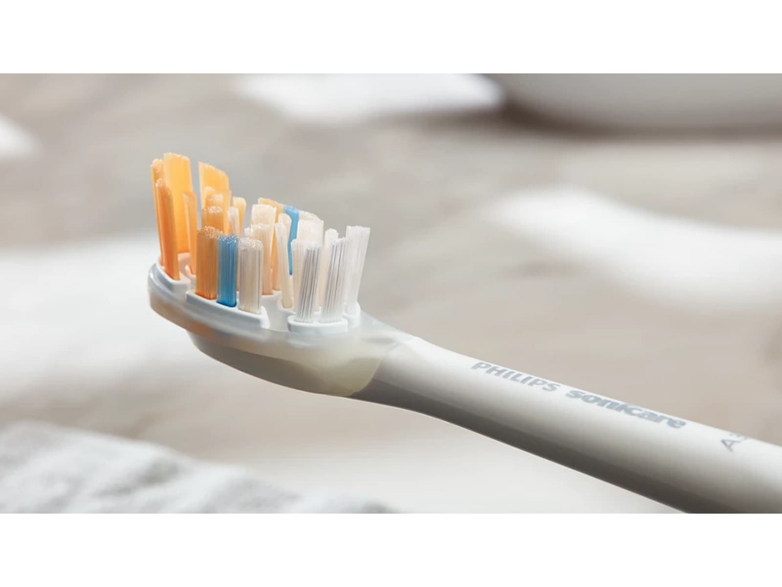 Sidoborstarna på borsthuvudet med extra räckvidd borstar försiktigt tandköttet, även när du fokuserar på tänderna. Borsten böjs för att kompensera för övertryck.
