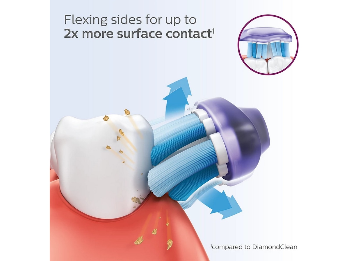 Detta förbättrar vår soniska rengöringseffekt och säkerställer en djupare rengöring även på svåråtkomliga områden. Tack vare sin flexibla design tar Premium Gum Care bort upp till 10 gånger mer plack än en manuell tandborste.