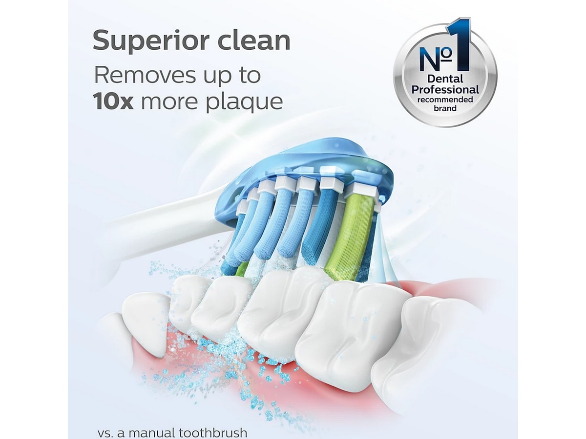 Philips Sonicares avancerade ljudteknik pulserar vatten mellan tänderna, medan borsten bryter upp plack och borstar bort det för att ge dig en mycket bra daglig borstning.