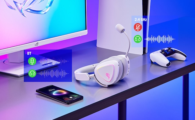Bluetooth, ultra-låg latens ROG SpeedNova 2.4 GHz trådlöst och en trådbunden 3.5 mm anslutning säkerställer kompatibilitet med PC, Mac, PlayStation® 4 och 5, Nintendo SwitchTM, Xbox One, Xbox Series X|S* och mobila enheter.