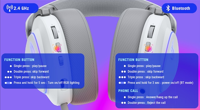 Dedikerade rullhjul på varje öronkåpa låter dig justera den trådlösa ljudvolymen från båda anslutna källor oberoende. Det finns också en knapp som låter dig svara på mobil samtal medan du spelar ett spel.