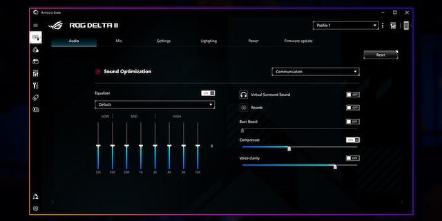 Armoury Crate-programvara har ett intuitivt gränssnitt för att maximera ljudprestanda och omfattande kontroller över EQs, RGB-belysning och ström, vilket skräddarsyr din ljudupplevelse helt efter dina önskemål. Förbättra mer bas, diskant eller ett balanserat ljud på EQ-profilinställningar för att göra ljudet i spelet ännu mer uppslukande.