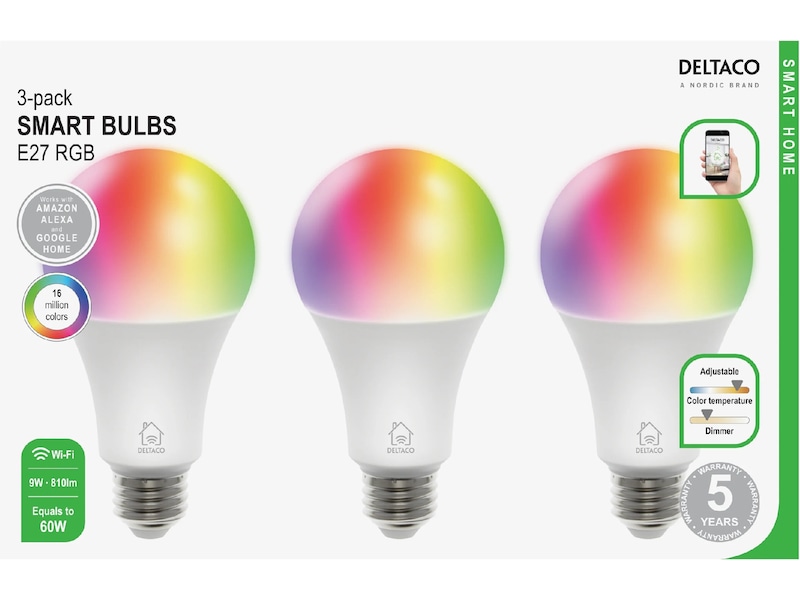 SMART HOME RGB LED-lampa 3-pack, E27, WiFI 2,4GHz, 9W, 810lm, dimbar, 16m färger, 220-240V, vit
